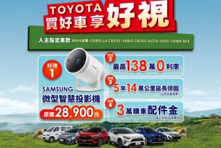 本次活動除贈送超高音質的「JBL PartyBox On-The-Go Essential可攜式派對喇叭」註1外,本月入主指定車款可享最高80萬高額0利率註2分期優惠。「Toyota一起響樂」優惠活動自即日起至6月底止,贈品數量有限,送完為止,買車最佳機會最後倒數!詳細優惠活動資訊請至Toyota官網:https://www.toyota.com.tw/event/202505JBL,或洽詢Toyota全台展示中心。和泰汽車保留以上活動內容變更及最終解釋之權利,變更或修改訊息將於Toyota官網公布,恕不另行通知。