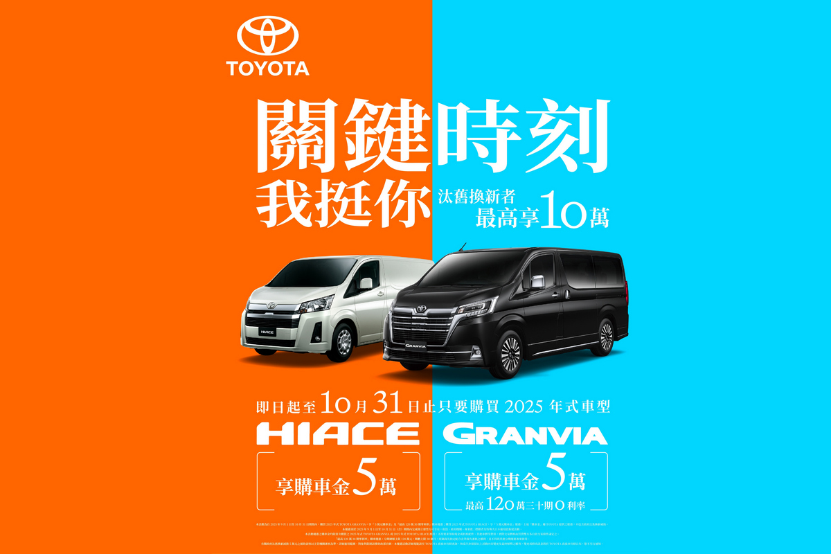 本活動對象:限購買2025年式Toyota Granvia及2025年式Toyota Hiace車型適用;不適用租賃、政府機關、專案批 / 標購者及特殊大口。