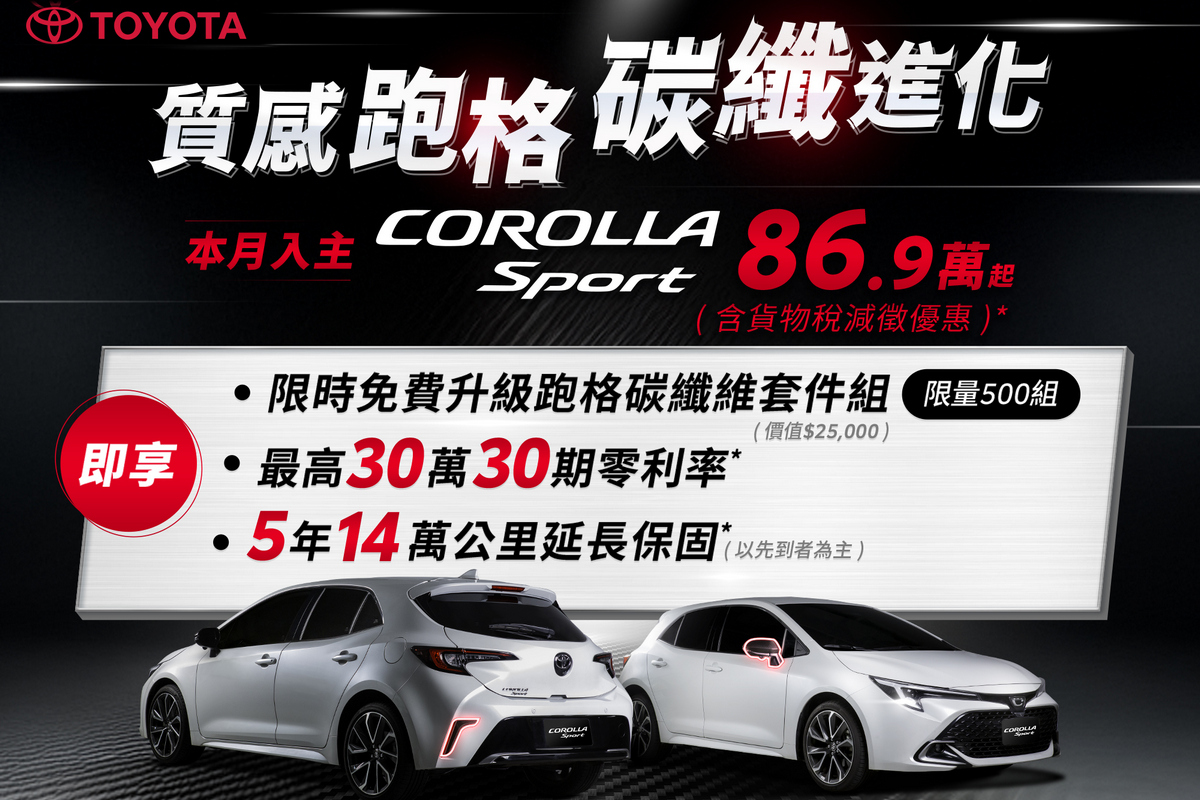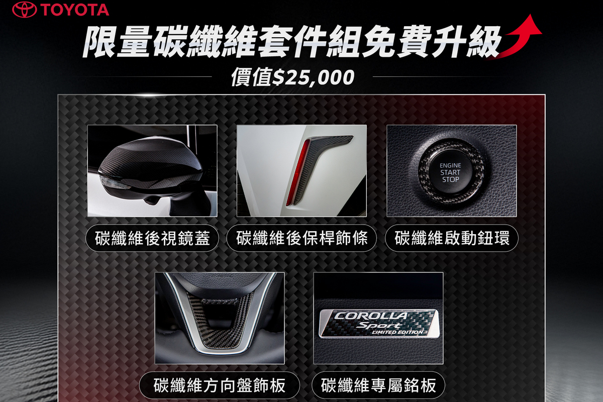 註1:本活動之適用對象為於2025/10/1-2025/10/31期間內購買Corolla Sport者,即可免費安裝碳纖維套件組:(1)碳纖維後視鏡蓋 (2)碳纖維後保桿飾條 (3)碳纖維啟動鈕環 (4)碳纖維方向盤飾板 (5)碳纖維專屬銘板。限量500組,送完為止。前述贈品以實物為準且須於交車時同時搭載,恕不接受更換退費、折抵現金或自行攜回。安裝碳纖維套件組者,不需額外支付安裝費用,並將由原購車經銷商提供安裝及保固服務,保固期限為自交車日起4年或120,000公里以內(以先到者為準)。前述贈品均有作動限制,且與新車保固內容不同,贈品詳細保固內容、使用說明及限制請洽原購車經銷商了解使用手冊及相關公吿説明。任何贈品使用及保固相關疑問,請逕洽原購車經銷商,和泰汽車不負任何贈品擔保責任。本活動不適用租賃、政府機關、專案批/標購者及營業車。