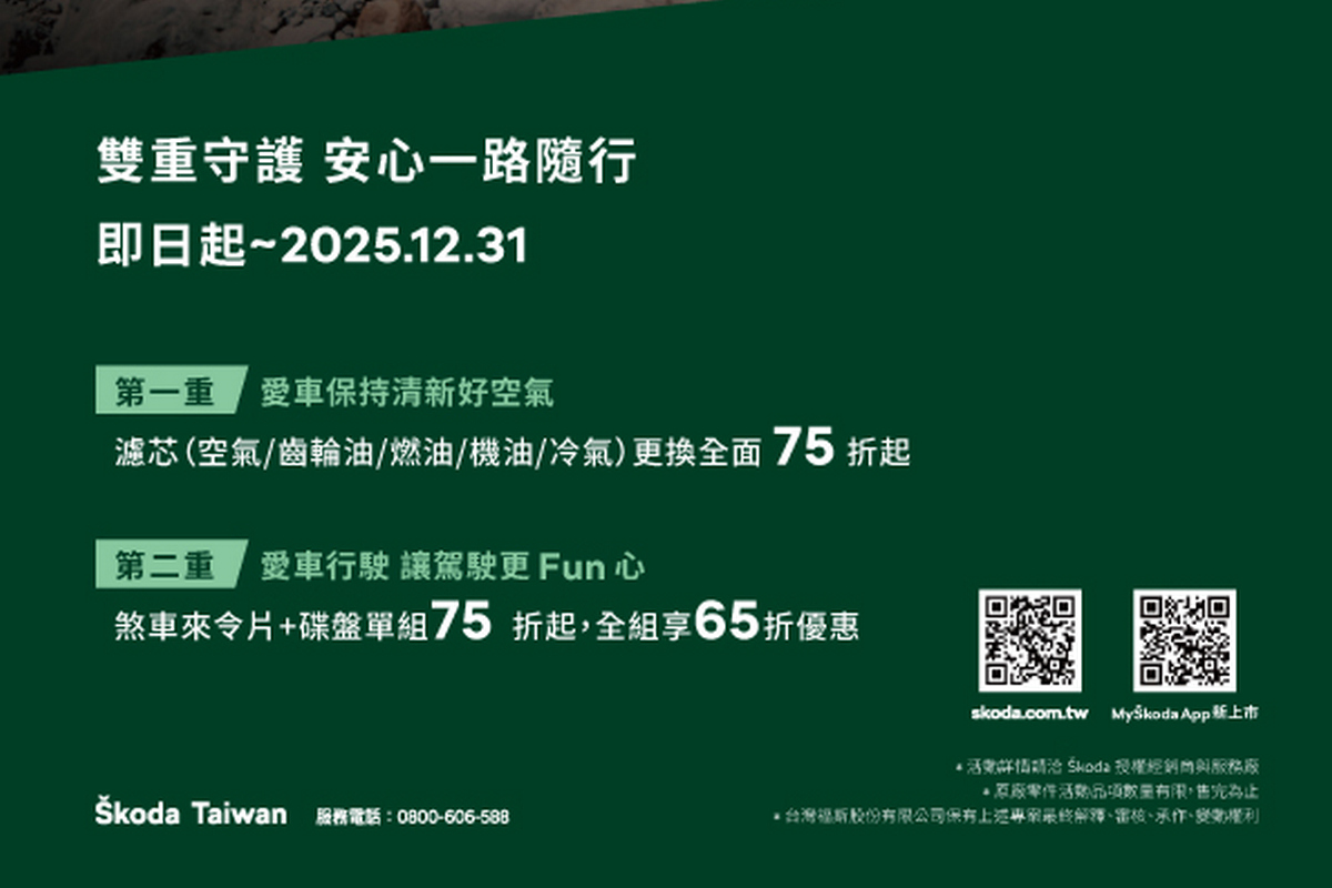 從潔淨的濾芯到穩健的煞車系統,Škoda 以原廠零件的高品質與嚴格工序,確保車輛的最佳狀態,讓駕駛在任何天候與路況下,都能感受最穩定、最安心的守護力。即日起,全台 Škoda 授權服務中心均可預約參與此專案。誠摯邀請車主回廠檢修,與 Škoda 一同以真誠的關懷與專業技術,延續每一段旅程的安心與信賴。