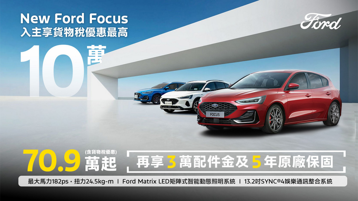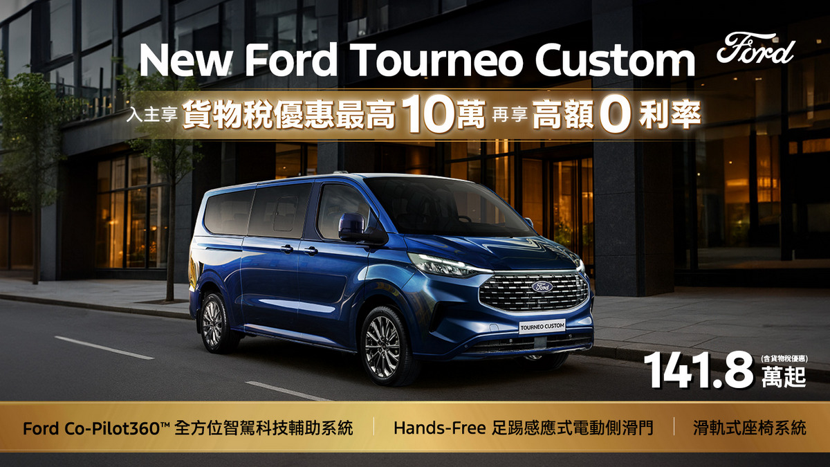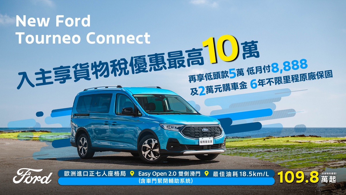 Ford指定車款享貨物稅減徵最高10萬元,係指New Ford Focus國產全車系、New Ford Tourneo Connect福特旅玩家全車系、New Ford Tourneo Custom福特旅行家全車系,享新制貨物稅減徵優惠,最高補助10萬元。