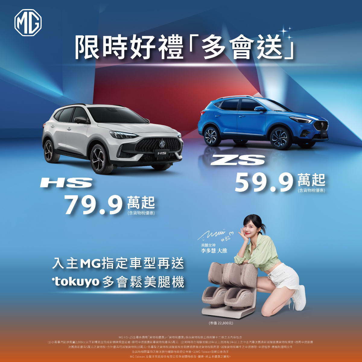 各車款建議售價及購車優惠資訊詳情依MG Taiwan官網線上訂車之公告為準。 規格配備以台灣實際銷售車款為準,MG Taiwan保留規格配備變更或停用之權利。 MG Taiwan保有最終修改、變更、活動解釋及取消本活動之權利,更多詳情請向MG Taiwan授權經銷商洽詢。 優惠貸款方案均限指定合作對象並保有審核之權利。 MG HS、ZS、G50 Plus 全車系適用貨物稅修正條例第十二條之五內容,包含(1)小客車汽缸排氣量2,000cc以下新購買並完成新領牌照登記者,即可申請退還新車貨物稅最高5萬元 (2)同時符合報廢出廠10年以上且持有1年以上之中古車汽車汰舊換新減徵退還貨物稅規定,得再申請退還舊換新最高5萬元之貨物稅,合計最高可減徵貨物稅10萬元 (1) tokuyo-多會鬆 踝旋美腿機,型號:TF-660,顏色 : 奶茶棕、藍貓灰,隨機出貨不指定。(2) Panasonic-溫感氣動足腿按摩靴,型號:EW-RA190,顏色 : 玫瑰櫻、柔霧灰,隨機出貨不指定。 (3) 僅提供至MG展示中心領取,不提供指定地點配送。(4) 以實物為準,不接受退費或更換等值商品。保固說明、限制範圍及使用辦法詳見產品說明書。(5) 產品由督洋生技提供原廠保固一年,商品諮詢或產品維修由督洋生技提供免費客服專線0800-369-963,週一~週五09:00–12:00&13:00–18:00(國定例假日除外)。 |