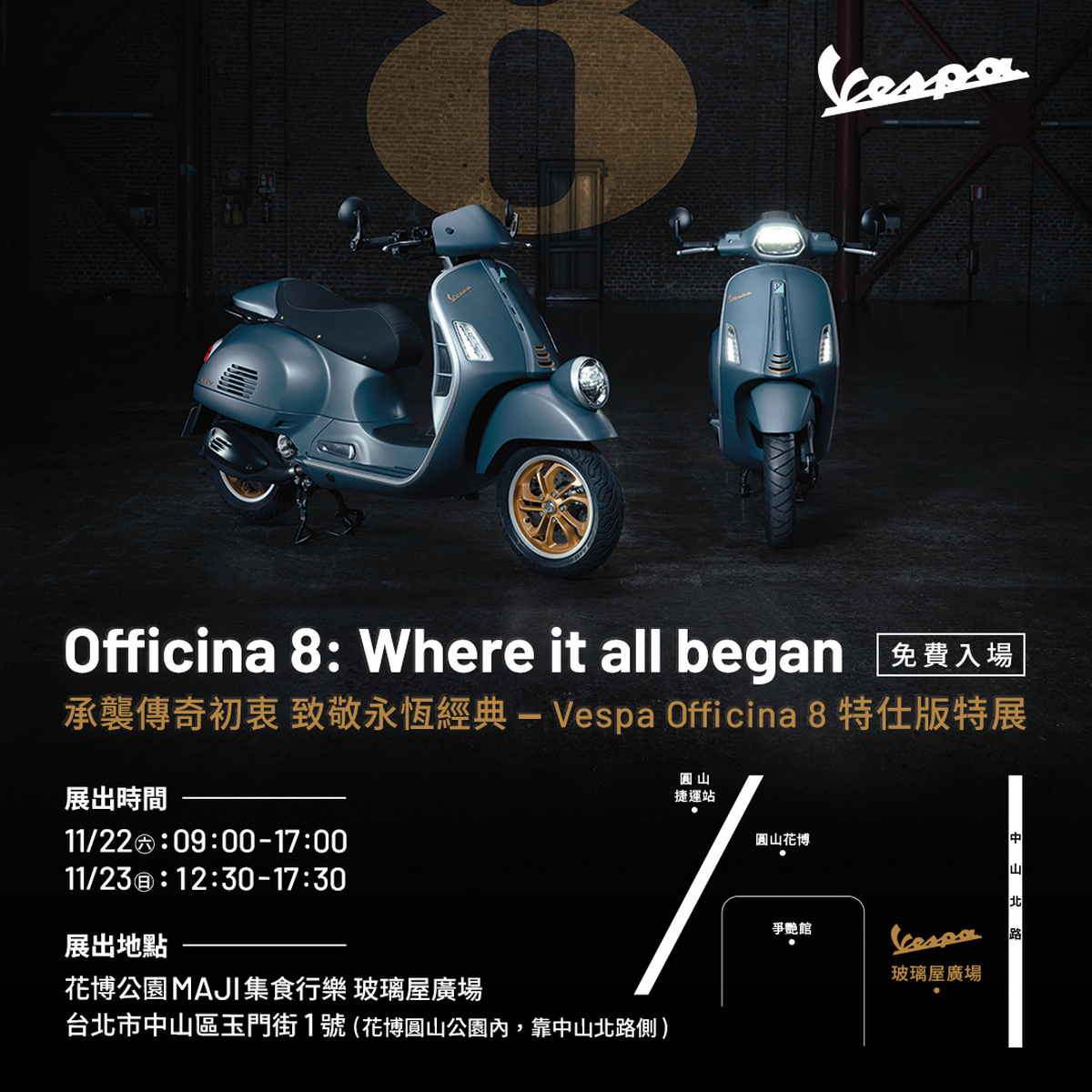 充滿傳奇色彩的Vespa Sprint與GTV Officina 8特仕版,上市即掀起熱烈迴響,印證了Vespa在台灣兩輪市場收藏界的地位與珍稀價值。為了讓更多民眾了解這份源自義大利、橫跨80年的傳奇故事,Vespa總代理太古運通特別於台北花博舉辦限時兩日的「Officina 8 : Where it all began承襲傳奇初衷 致敬永恆經典—— Vespa Officina 8特仕版特展」,邀請一般民眾免費參觀,一起見證速克達誕生的起點。本特展透過珍貴照片與設計圖稿,分享「Officina 8」第8號工作坊的歷史沿革,帶民眾深入認識Vespa的歷史背景與發展軌跡,現場亦同步展出兩款Officina 8特仕版實車,包含全台限量僅25台且已完售的Vespa GTV Officina 8特仕版,讓向隅的Vespa車迷可近距離鑑賞。而錯過GTV版本的車迷,請千萬不要錯過11月份總代理提供的Vespa Sprint Officina 8專屬購車優惠,包括高額零利率在內的購車優惠方案三擇一,還享貨物稅減徵補助NT$2,000元、及原廠2+1年保固延長,輕鬆入主傳奇特仕車。