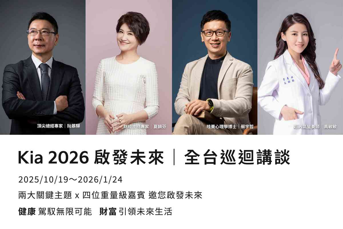迎接在台邁入第12年,Kia總代理台灣森那美起亞為讓Kia車主更深切體驗Kia的品牌核心價值「啟發」,自今年10月起啟動的「2026 Kia啟發未來|全台巡迴講談」同步熱烈展開,邀請來自健康與財經領域的專家達人,親臨全台Kia展示中心,與車主面對面分享、攜手描繪邁向2026年的藍圖。本周末11月22日(六),將特別邀請財經專家暨節目主持人—夏韻芬,於 Kia土城展示中心主講「AI世代理財力:科技財富新思維」,從「迎向AI浪潮:新世代必備財商思維」、「AI科技洞察:創造全齡樂享人生」兩大面向出發,帶領現場聽眾以AI科技洞悉市場趨勢,探索科技與財富的未來可能。誠摯邀請喜愛Kia的朋友們,即刻線上報名(註2)參加,共同感受Kia「Movement that inspires 移動・啟發人心」的品牌魅力。