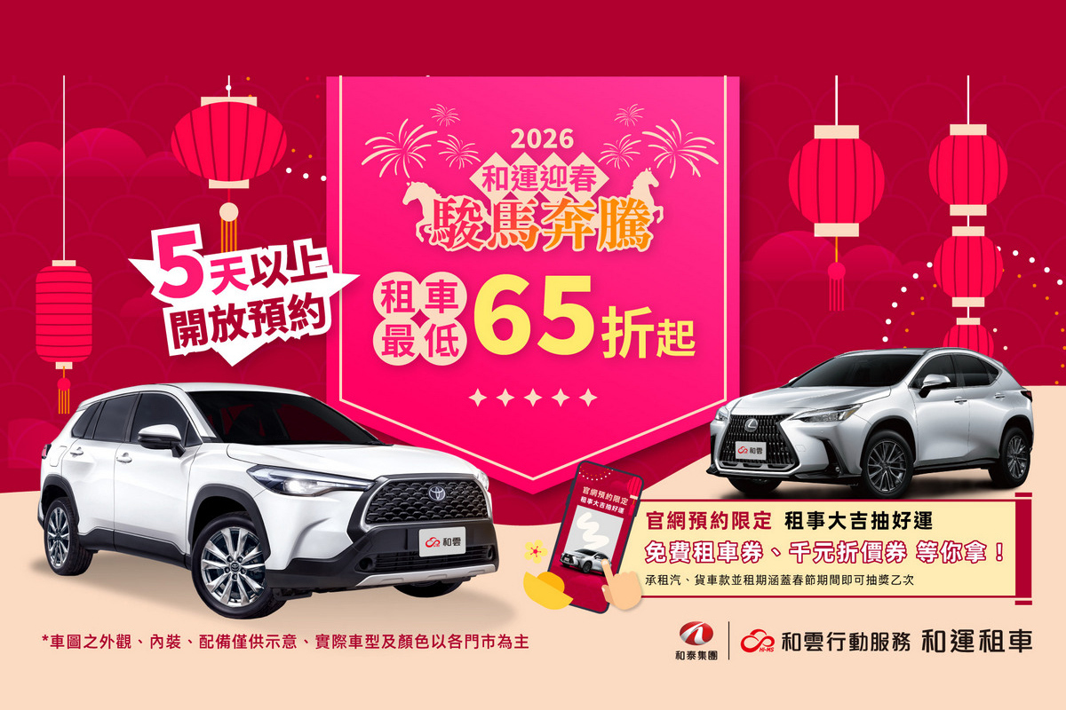 和運租車門市即日起,開放春節期間2026年2月13日至2026年2月22日止,一般車款5日(含)以上與Lexus NX200豪華車款3日(含)以上的早鳥用車預約,並推出五重優惠活動: