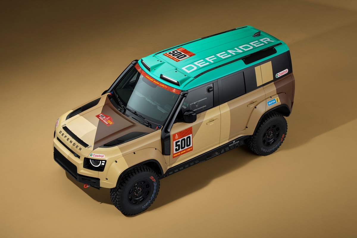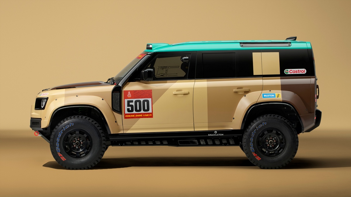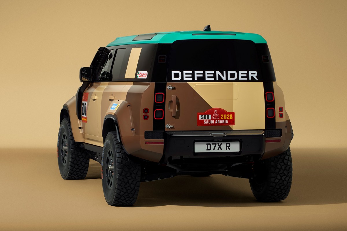 Defender Dakar D7X-R 將以結合原始、自然與強悍的全新競賽塗裝亮相,其靈感源自沙漠的色調與質感。全新的 Geopalette 設計取材自達卡的乾旱地貌,融合沙、石與土色,並加入一抹水藍,象徵沙漠中罕見的水源,展現對比與純淨感。