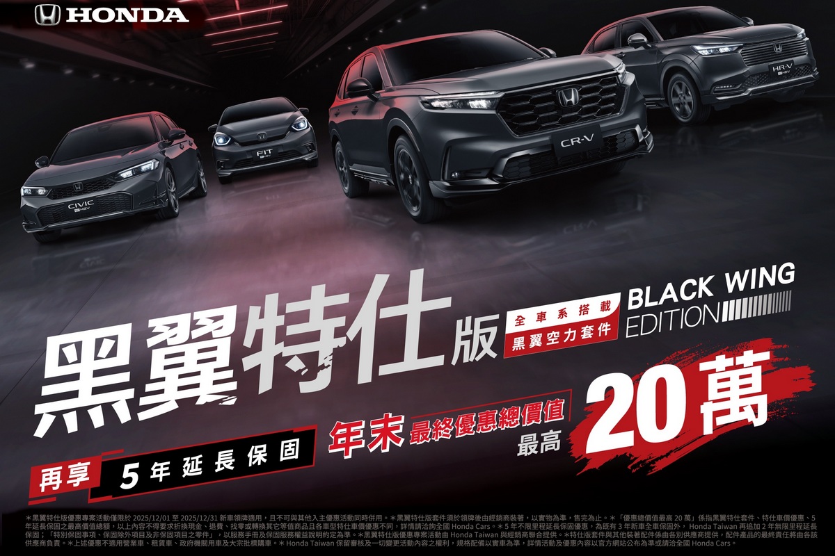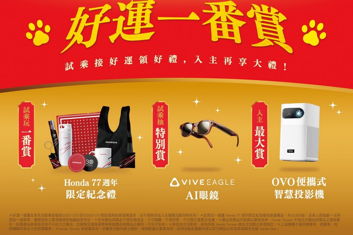 歡慶Honda誕生77週年,Honda Taiwan推出年終超值豪禮,即日起限時入主Honda全車系,享「OVO便攜式智慧投影機*1」或「黑翼特仕版與5年延長保固*1」二擇一豪禮,指定車款優惠總價值最高達20萬元。活動期間至全國Honda Cars試乘全車系,即可參加「好運一番賞」活動贈送的「Honda 77週年限定紀念禮」(7抽1)、週週再抽「VIVE EAGLE AI眼鏡」讓您帶回家。歡迎即刻至官網預約試乘或親臨全台展示中心,感受Honda的人車一體操控性能,重新定義您對駕馭樂趣的想像。