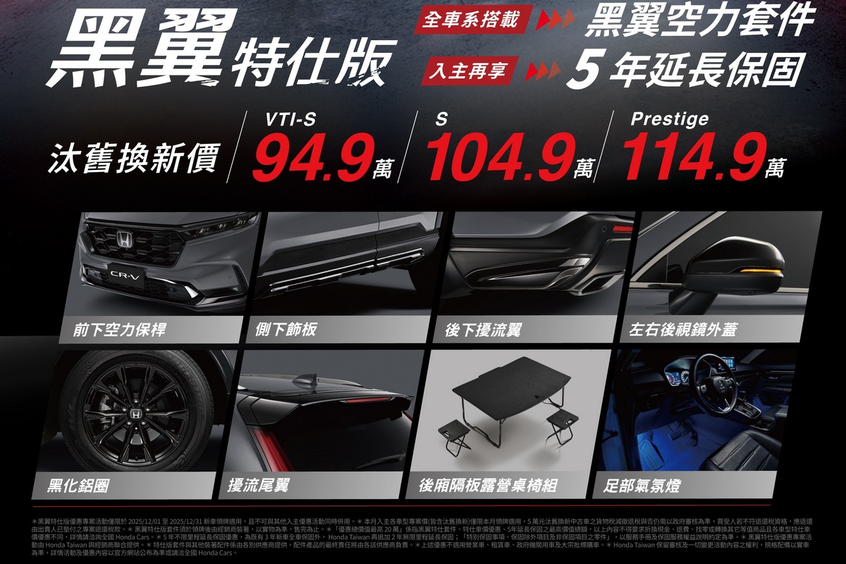 為感謝消費者對CR-V 30年來的一路支持,即日起~2025/12/31止入主CR-V享「OVO便攜式智慧投影機*1」,並可享汰舊換新價VTi-S 94.9萬元、S 104.9萬元、Prestige 114.9萬元優惠。針對追求動感跑格輪廓與運動化設定的消費者,入主禮可選「黑翼特仕版與5年延長保固*1」專案,其中特仕版內容為「前下空力保桿、側下飾板、後下擾流翼、左右後視鏡外蓋、黑化鋁圈、擾流尾翼、後廂隔板露營桌椅組、足部氣氛燈」,總價值最高達20萬元優惠,實現滿載全家人的移動夢想喜悅。