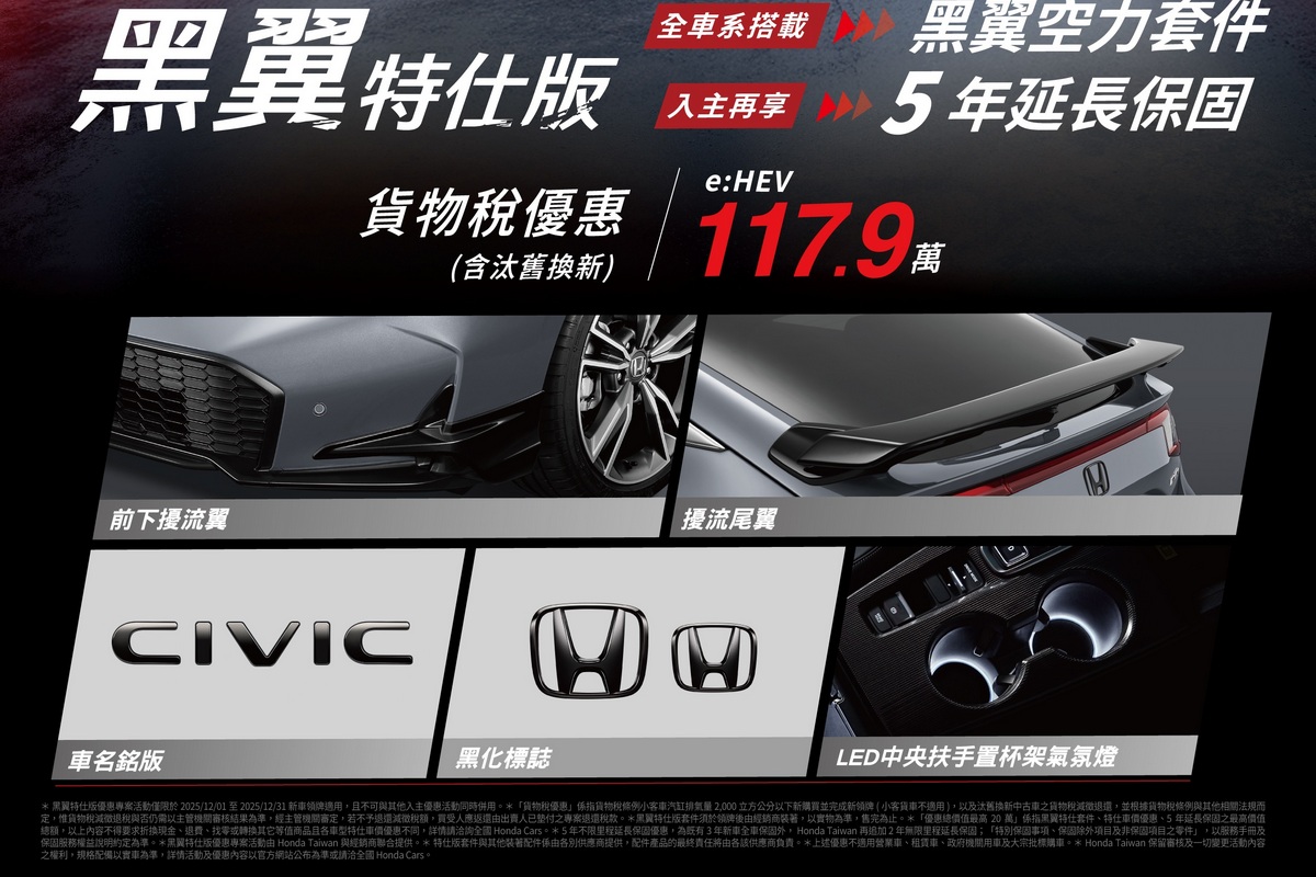 即日起~2025/12/31止入主Civic e:HEV次世代電油車享「OVO便攜式智慧投影機*1」或「黑翼特仕版與5年延長保固*1」專案二擇一好禮,並可享貨物稅優惠(含汰舊換新)117.9萬元。其中空力套件組包含「前下擾流翼、擾流尾翼、Civic車名銘版、前後H黑化標誌、LED中央扶手置杯架氣氛燈」,成就買家獨具魅力的零里程焦慮駕乘體驗。