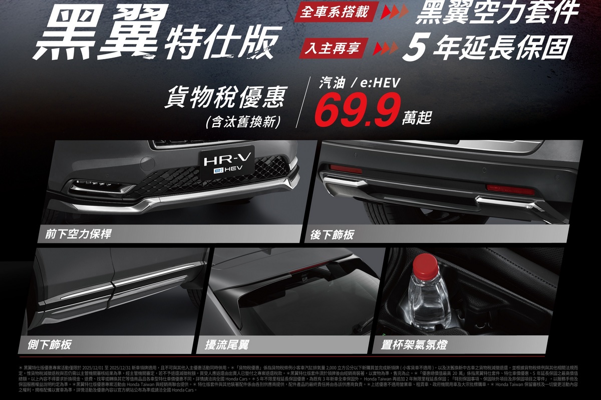 即日起~2025/12/31止入主HR-V享「OVO便攜式智慧投影機*1」或「黑翼特仕版與5年延長保固*1」專案二擇一好禮,並可享貨物稅優惠(含汰舊換新)69.9萬元起。其中特仕版包含「前下空力保桿、後下飾板、側下飾板、擾流尾翼、置杯架氣氛燈」套件組豪禮,讓消費者輕鬆擁有獨樹一格的都會CROSSOVER跨界跑旅,體驗無與倫比的駕駛樂趣。