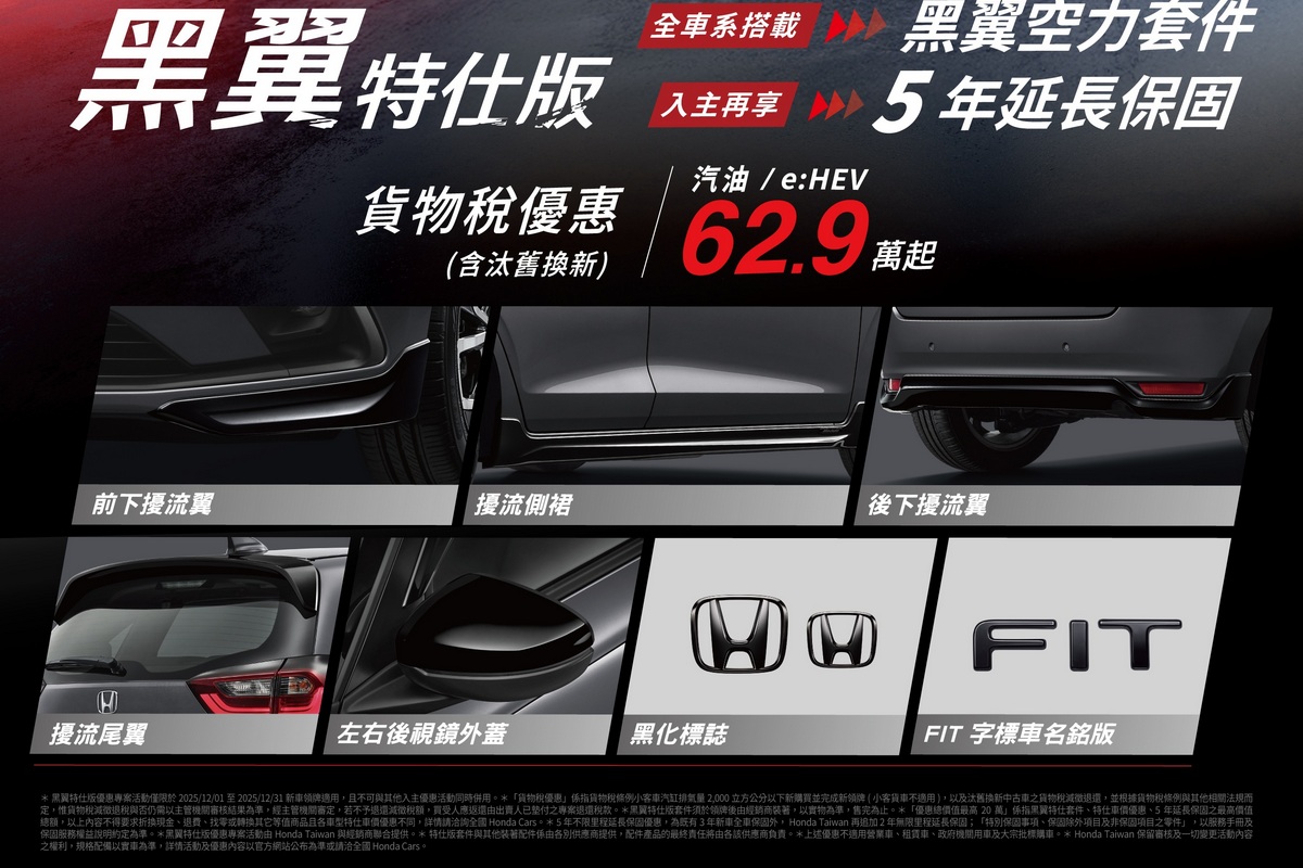 即日起~2025/12/31止入主FIT汽油版或節能省油王FIT e:HEV享「OVO便攜式智慧投影機*1」或「黑翼特仕版與5年延長保固*1」專案二擇一好禮,並可享貨物稅優惠(含汰舊換新)62.9萬元起。其中特仕版包含「前下擾流翼、擾流側裙、後下擾流翼、擾流尾翼、左右後視鏡外蓋、前後H黑化標誌、FIT字標車名銘版」的專屬豪禮,讓預算型買家購車零負擔。