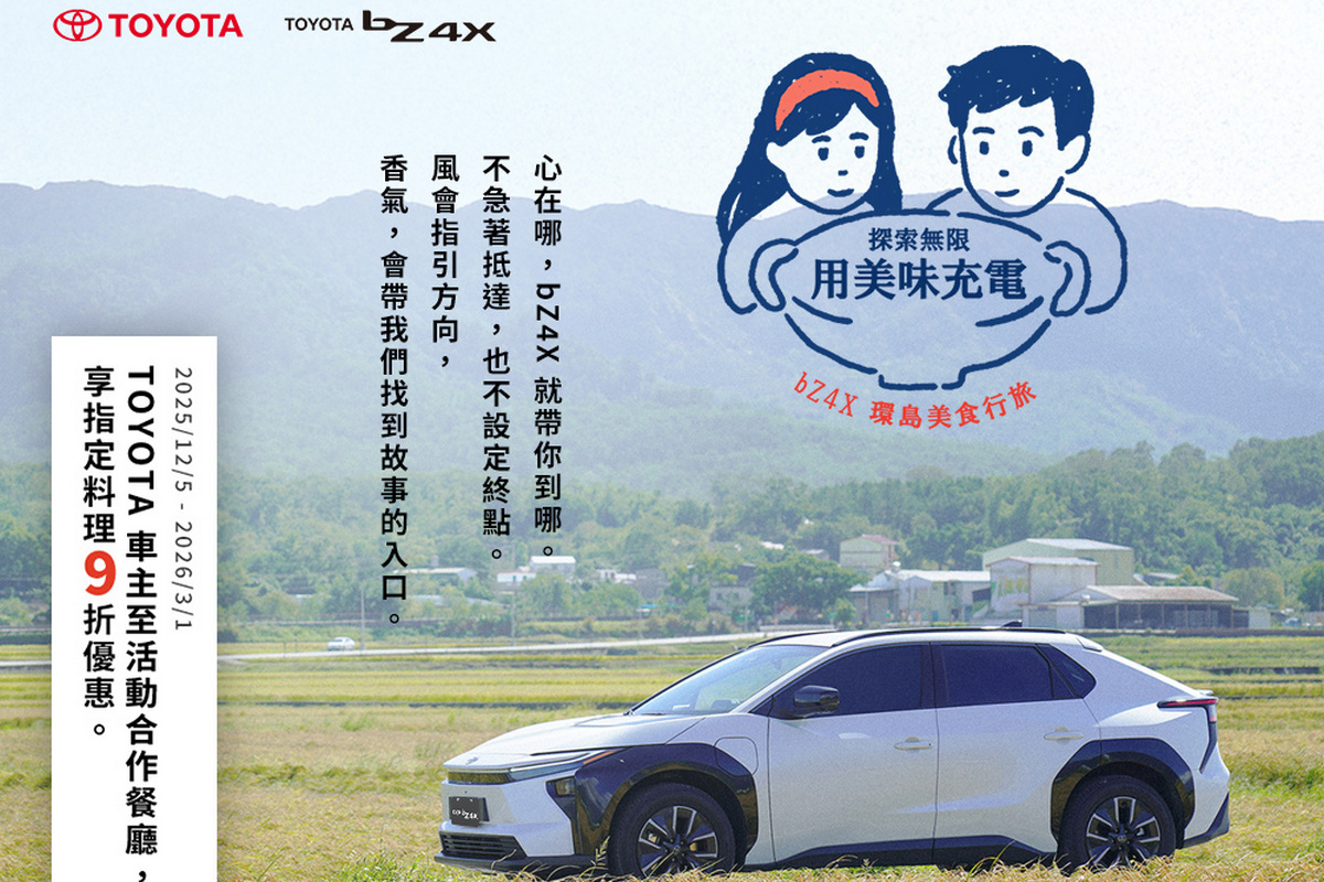 Toyota 宣布全新跨界合作企劃──「探索無限 用美味充電|bZ4X 環島美食行旅」,推出全新系列影片,以 bZ4X 作為旅程主角,透過純電移動的視角記錄美食、風景與旅途上的故事,見證全新bZ4X的進化特點,包含最大馬力 227ps註2、 743 公里續航里程註3、 TSS 3.0 主動安全系統註4,並以科技感外觀呈現獨特風貌,陪伴我們展開全新的旅程! 此外,Toyota攜手本次影片中八家風格獨具的特色餐廳,打造bZ4X限定料理。活動期間,Toyota 全車系車主至上述餐廳出示車鑰匙,即可享 bZ4X 主題限定料理 9 折優惠註1,以美味為旅程補給,重拾移動與探索的樂趣。