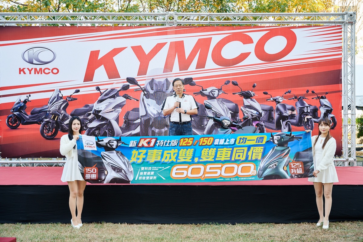 「新 K1 125/150 特仕版」展現Kymco「好事成雙、大升級、大滿配」特仕版設計理念,125/150系列同步搭載「LED大燈與全液晶螢幕雙科技、雙避震(後)、雙碟煞(前後)、雙1級省油、雙帽大空間、雙置物掛勾」頂規配備,不僅超越競爭對手,重新定義大眾通用型車款的新級距,劍指125、150市場,目標勝者全拿,積極搶市。Kymco 光陽集團董事長柯俊斌在眾人期待下正式宣布「新K1特仕版 125/150雙車同價最低60,500」限時優惠即日開跑,消費者可以開始向光陽全台通路訂購,「新K1特仕版」也正式量產。