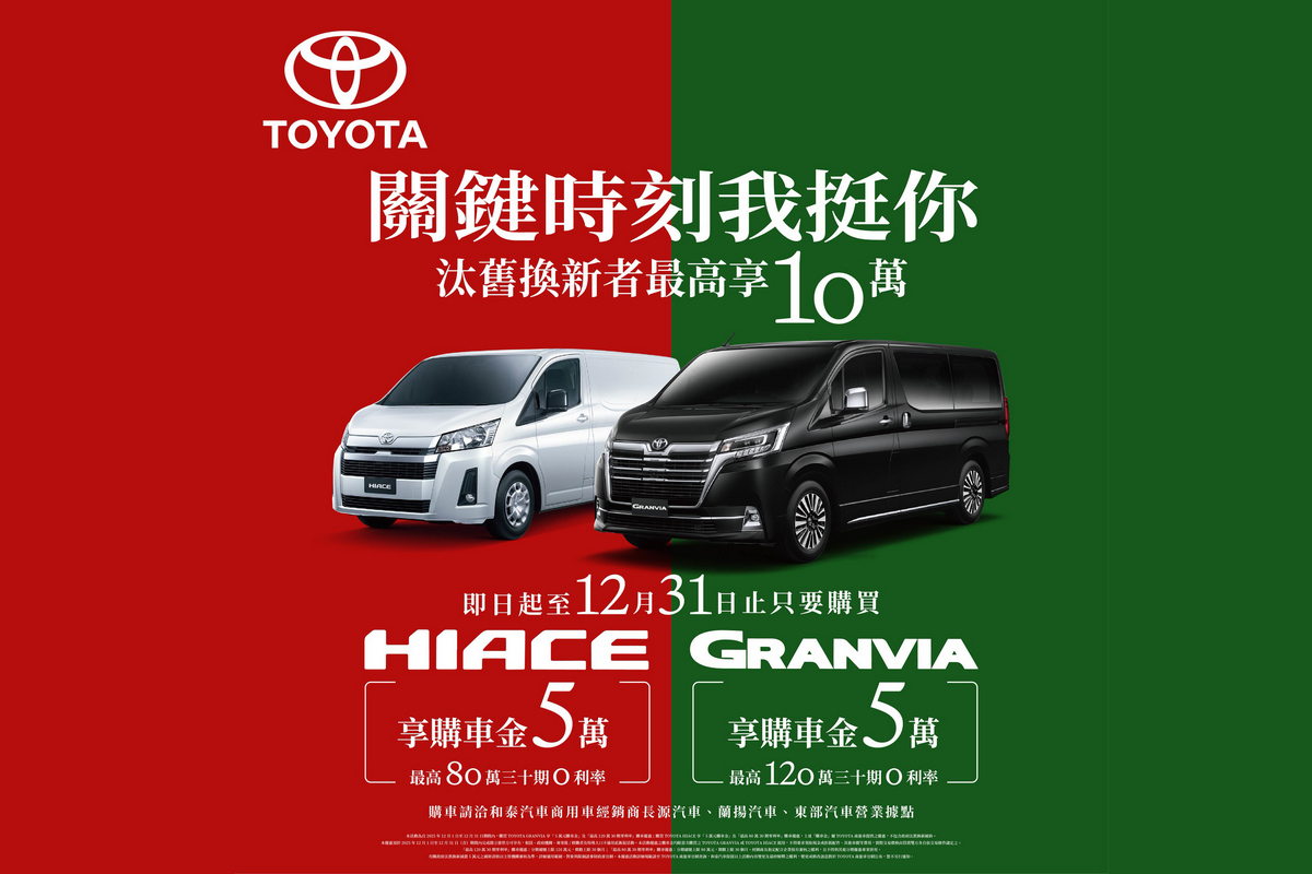 Toyota商旅車以多元車型滿足各式商務載運及家庭用車需求,廣受台灣消費者喜愛。為感謝消費者長期的支持,並積極響應政府汰舊換新貨物稅減徵補助政策註1,Toyota商旅車於本月持續推出「關鍵時刻我挺你」購車優惠活動註2,即日起至12月31日止,購買Toyota Granvia即享「5萬元購車金註2」及「最高120萬30期零利率註3」優惠;購買Toyota Hiace即享「5萬元購車金註2」及「最高80萬30期零利率註3」優惠,以最實在的購車禮遇回饋消費者,誠摯邀請您輕鬆入主Toyota商旅車優質車款,即刻體驗Toyota商旅車靈活操控性能與卓越移動體驗。