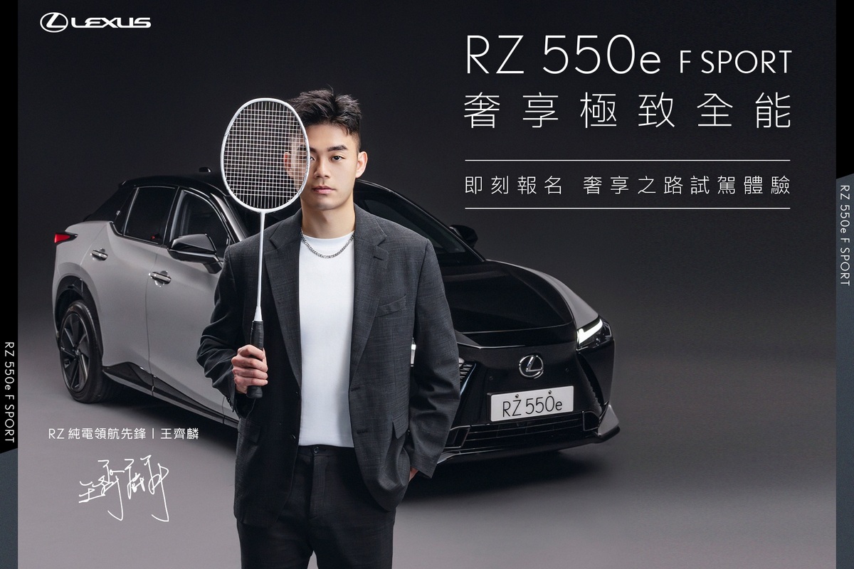 同時,Lexus也推出「Lexus RZ 550e F Sport 奢享之路試駕體驗」活動,由「RZ純電領航員」王齊麟帶隊,邀請消費者入座試駕,一同見證Lexus 豪華電能美學的新篇章!即日起至 12 月 21 日止,填妥報名資訊,即有機會駕乘RZ 550e F Sport,前往王齊麟推薦的私房景點,親身感受 RZ 550e F Sport 的純電駕馭魅力並與王齊麟面對面交流;於活動指定貼文完成指定互動,還有機會獲得王齊麟親筆簽名羽毛球拍,詳細資訊請持續鎖定Lexus官方FB與IG粉絲團。