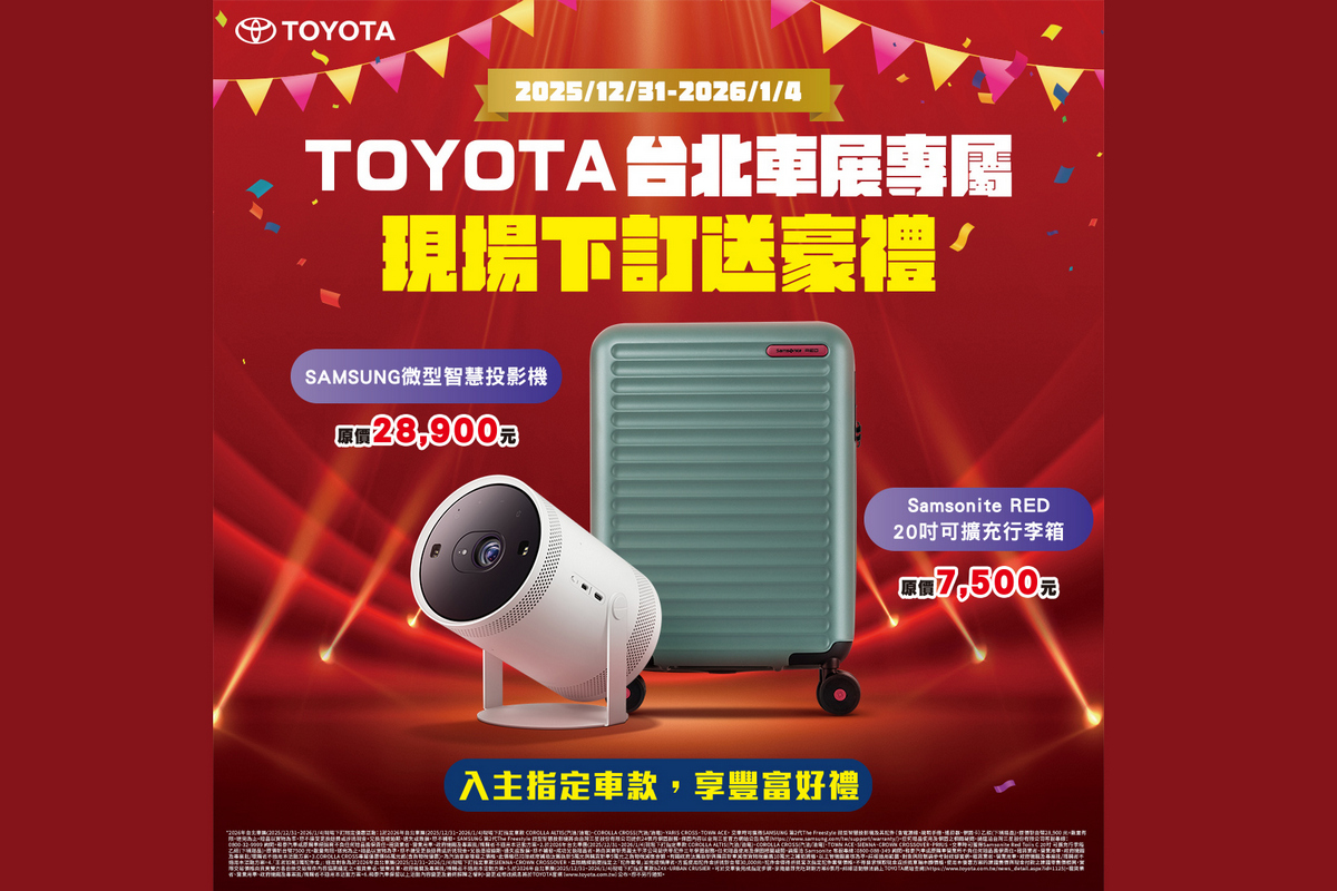此外,Toyota亦推出台北車展專屬「現場下訂送豪禮」註1限定活動,入主指定車款贈送Samsung 第2代The Freestyle 微型智慧投影機(原價28,900元)以及 Samsonite 20吋可擴充行李箱(原價 7,500 元),好禮數量有限,送完為止。同時,於車展現場下訂 SIENNA 與 CROWN CROSSOVER,可再享「王者加冕」3 萬元尊榮配件金;下訂純電車款 bZ4X 與 Urban Cruiser則享專屬「隨插即充」半年充電吃到飽方案,為電動車主帶來更無憂、更便利的用車體驗,陪伴顧客輕鬆邁向智慧電能新生活。Toyota感謝消費者一路以來的熱烈支持,讓每位入主 Toyota 的顧客不僅擁有卓越好車,更能享受超越期待的精采移動旅程。