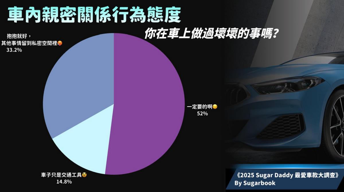 從車款品牌價格級距來看,約58.5%的Daddy 擁有新車價多在兩百萬以上、五百萬以內的豪華品牌車,有43%的Daddy 擁有新車價多在兩百萬以內的平價品牌者,而有7%左右的Daddy 擁有千萬以上的超跑或頂級豪華轎車。有趣的是,高達52%的Daddy 表示自己曾在車上「壞壞」,而有33.2%的Daddy 認為在車上「抱抱就好,其他事情留到私密空間裡」,將車作為情感醞釀的場所;僅有14.8%的Daddy 只將車子單純作為交通工具。而車價越高的品牌(Porsche, Tesla, BMW, Benz),車主對於車震的接受度越高;最愛車震的是開著Porsche 的Daddy。
