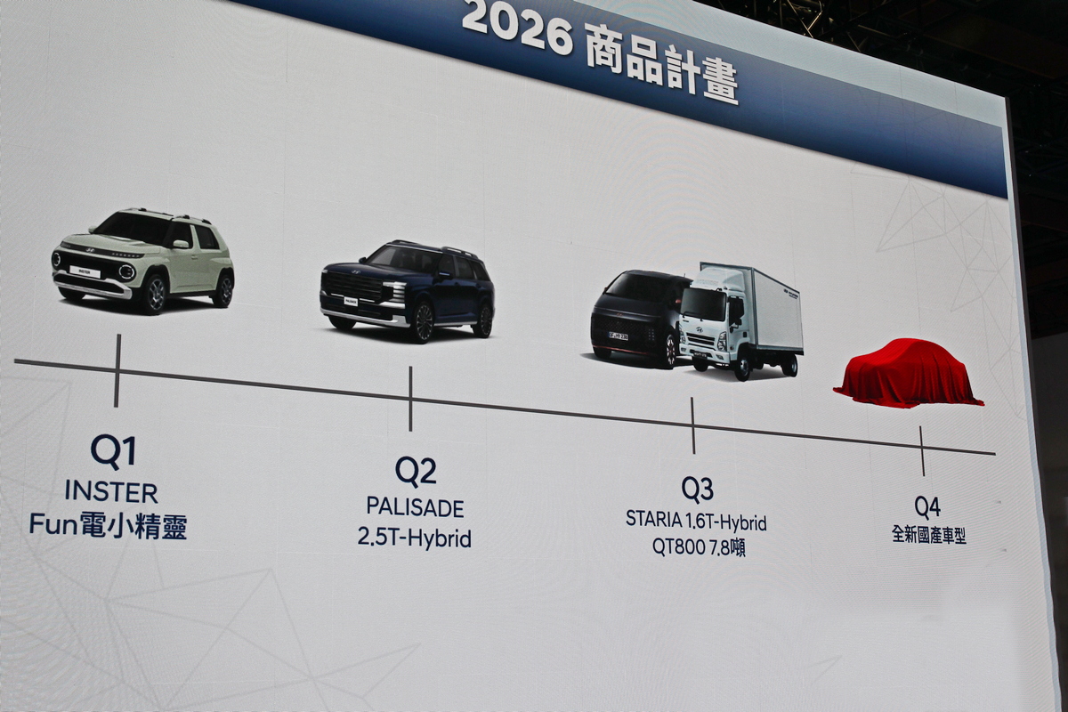 除了展出並預告第二季推出Palisade Calligraphy外,同時也公布2026年產品計畫,首先第三季將會推出Staria TurboHybrid車型,而第四季則會有國產車,至於車型目前尚不清楚,但從簡報來看則像似房車。