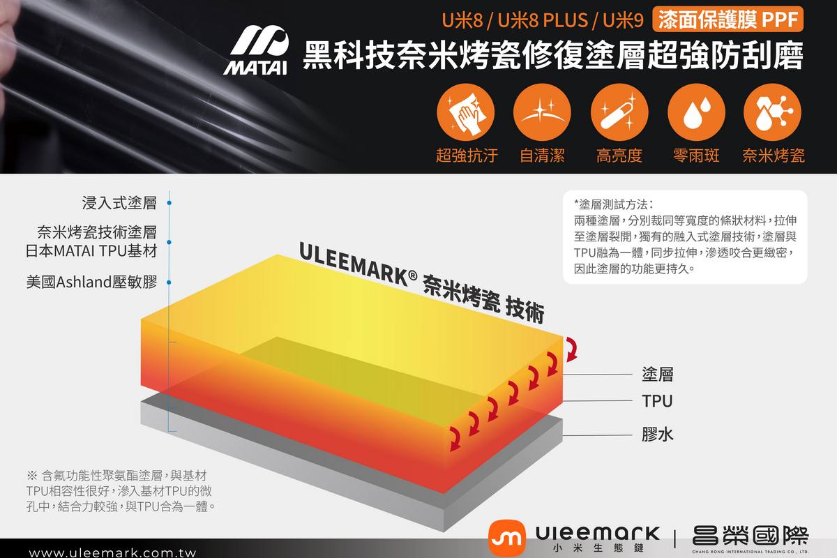 除隔熱紙產品外,Uleemark 亦同步引進漆面保護膜(PPF),採用日本 MATAI TPU 與德國 BASF 塗層原料並結合奈米烤瓷技術技術,具備耐候性與細微刮痕自我修復特性,提供車輛外觀的進階防護選擇。