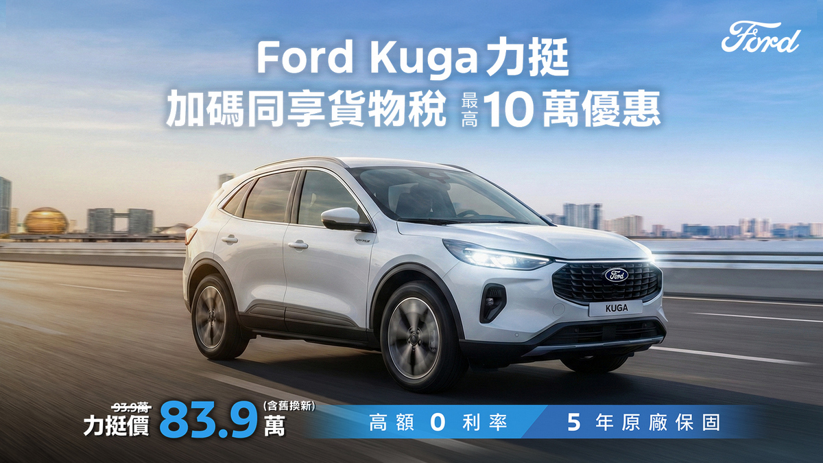 註二:The All-New Ford Kuga 1.5T享力挺價83.9萬起,係指The All-New Ford Kuga 1.5T Vignale建議售價93.9萬享5萬元力挺購車金,再扣除政府補助舊換新5萬元,詳細資訊請洽Ford經銷商。