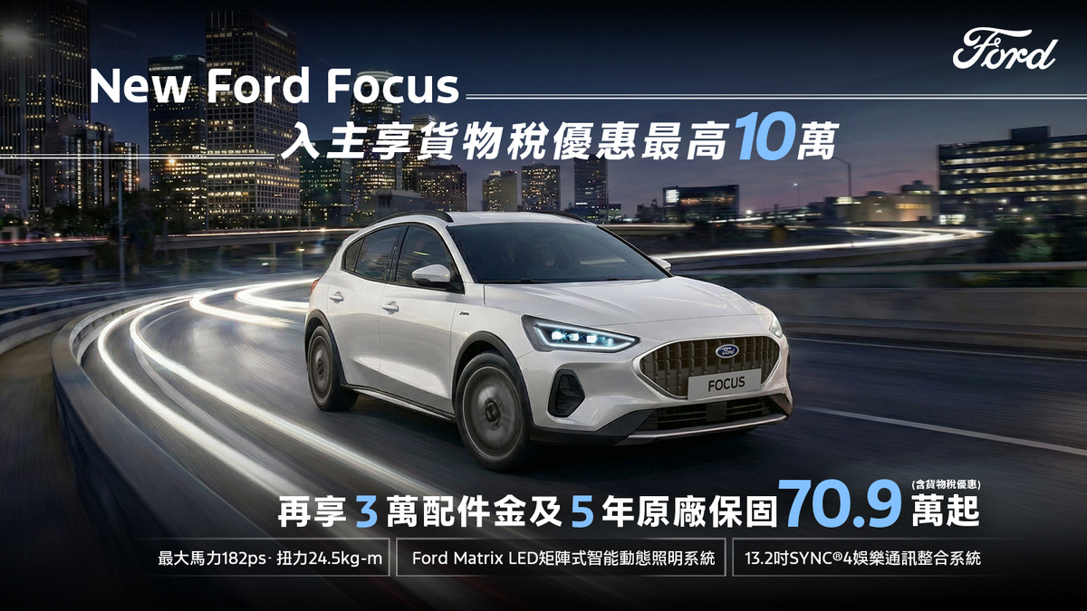Ford指定車款享貨物稅減徵最高10萬元,係指New Ford Focus國產全車系、New Ford Tourneo Connect福特旅玩家全車系、The All-New Ford Tourneo Custom福特旅行家全車系,享新制貨物稅減徵優惠,最高補助10萬元。