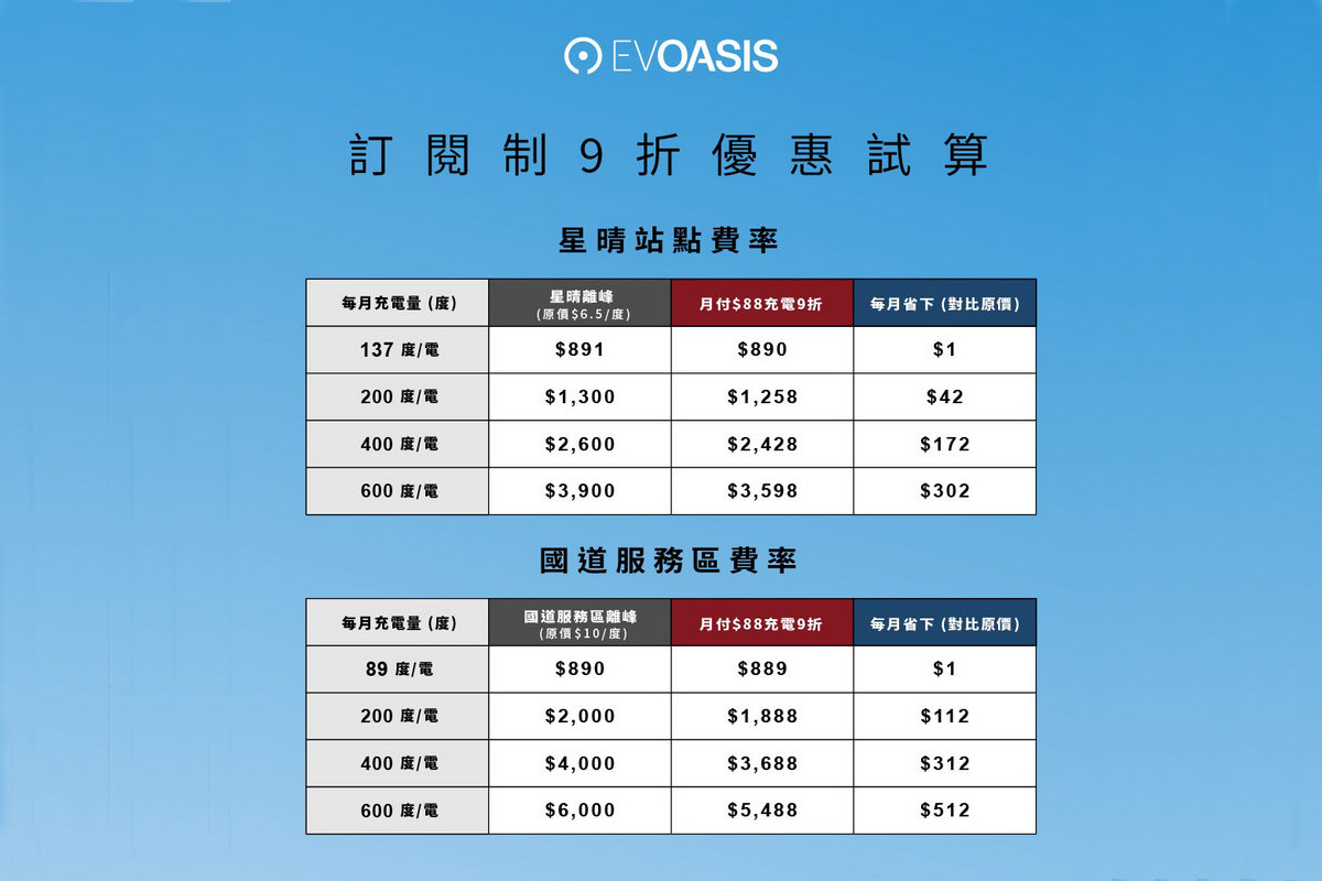 「月付 88 元」訂閱方案適用範圍涵蓋星晴費率站點與國道服務區站點,合計全台已超過 91 站,並將持續增加。優惠時段為平日離峰與假日全時段。以星晴平日離峰為例,原每度 6.5 元,訂閱後享 9 折,搭配 EVOASIS 儲值金 5% 回饋,以及指定信用卡最高 5% 回饋(以永豐銀行方案為例),回饋疊加換算後,每度電最低5.27 元。星晴假日原每度 8.4 元,訂閱後約每度 7.56 元;國道服務區離峰原每度 10 元,訂閱後為每度 9 元,讓平常通勤補電或長途行程在服務區補電,省錢更有感。