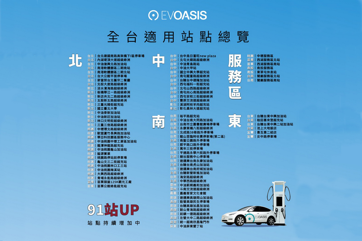 EVOASIS 董事長陶百群表示,「電動車主其實要的很務實——就是充電不要麻煩、價格要划算、路上找得到站點。這次我們用月付 88 元、充電 9 折的方式,先把最常用的充電情境照顧好:平日通勤、假日出遊,或是跑國道在服務區補電,都能更安心、更好掌握成本。」他也補充,EVOASIS 會持續擴大適用站點,今年全力瞄準電動車主最多的六都加新竹,接下來雙北、桃園、新竹和台中都有新站即將上線,讓更多車主在日常通勤路上就能用得到這個方案。