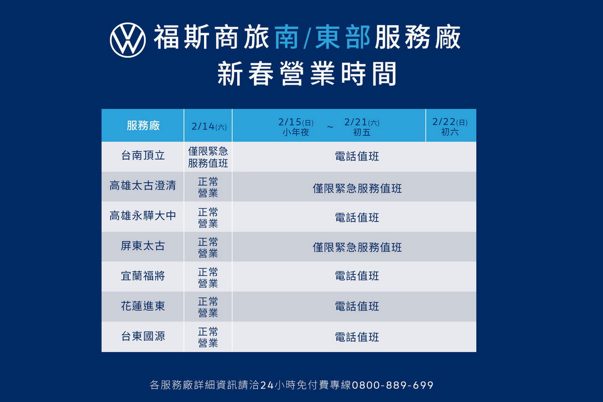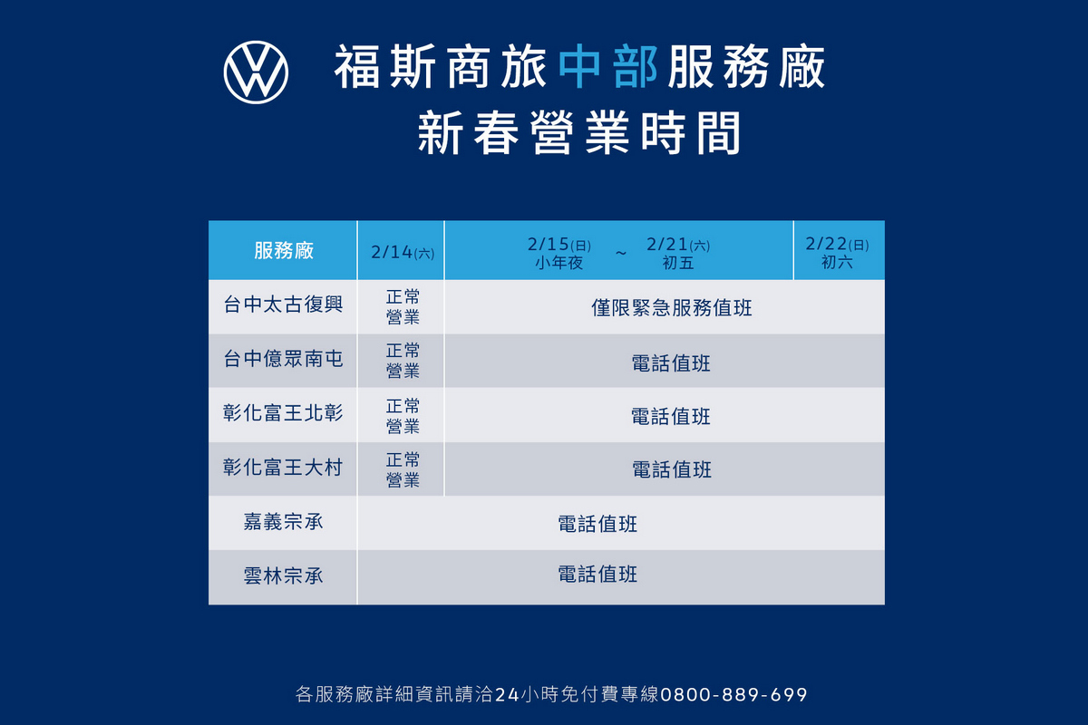 春節連假期間如遇緊急狀況,請撥打 24 小時免付費專線 0800-889-699,更多即時資訊請洽福斯商旅官方粉絲團 (https://www.facebook.com/VW.Bulli.Taiwan/)。