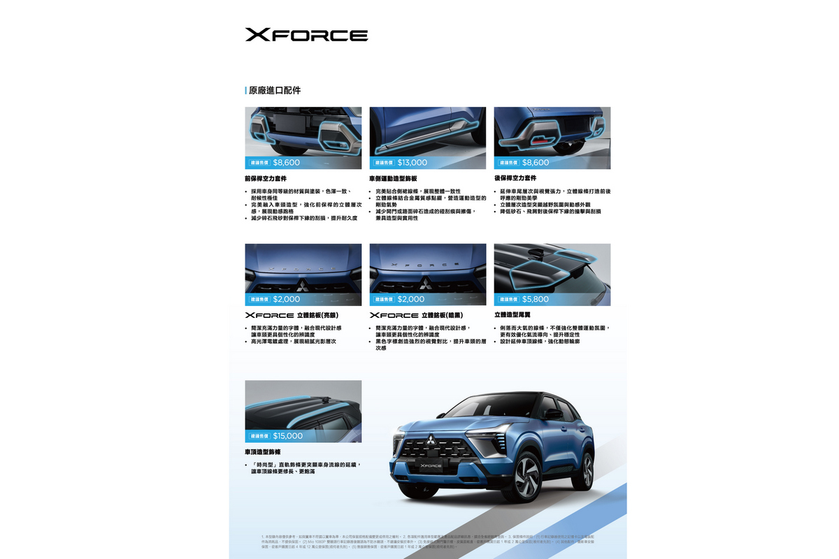 隨著汽車市場多元發展與消費者需求的提升,空力套件市場持續成長,無論是從效能的提升,還是外觀的個性化,空力套件都扮演著重要的角色。中華三菱本次導入XForce日本原廠進口配件,提供6件式升級部品,包含車型立體銘板、立體造型尾翼、車側運動造型飾板及前、後保桿空力套件、車頂造型飾條,消費者可依造自身需求,選購單一原裝配件,亦可整組加購,透過整體線條比例強化與細節優化,提升車身視覺張力與運動感,提供消費者兼具風格與質感的升級選擇。