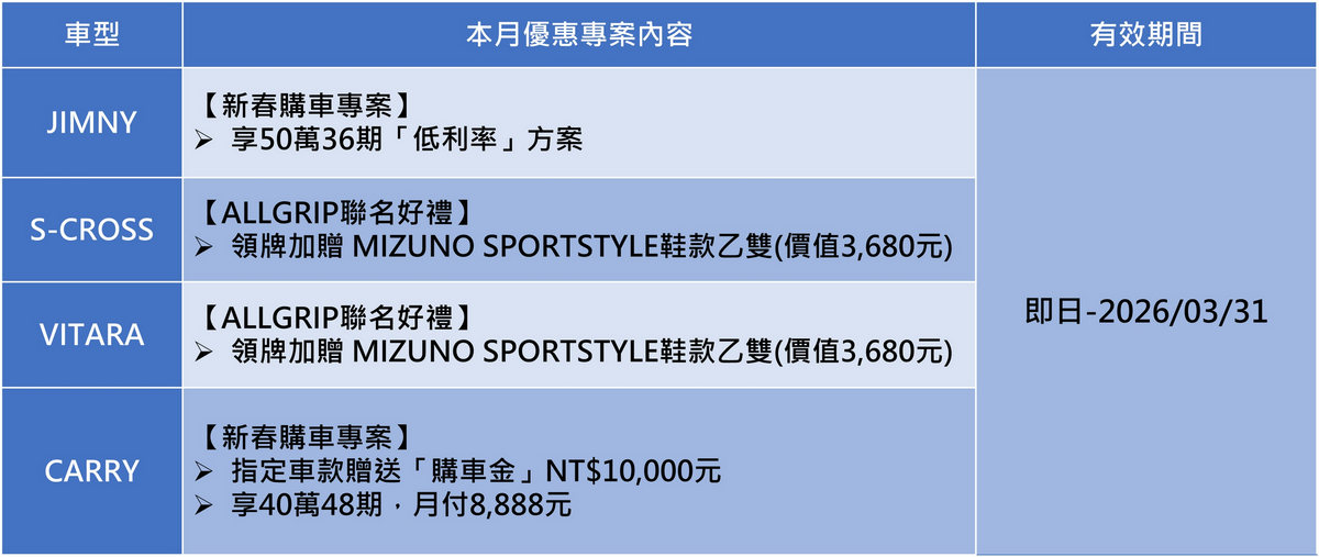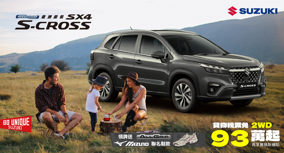 3. *「Suzuki ALLGRIPxMizuno 跨界聯名專案」:本活動之適用對象為於2026/03/01~2026/03/31期間內購買S--Cross 4WD、Vitara 4WD且完成領牌者,可獲得MXR乙雙(下稱贈品),原價新台幣3680元。數量及鞋子尺寸有限,送完為止。贈品以實物為準,恕不接受更換、退費或折抵現金。兌換憑證逾期、遺失或毀損,恕不補發。任何贈品使用之相關疑問,請逕洽台灣美津濃股份有限公司客服專線:02 2509-5100詢問, Taiwan Suzuki或原購車經銷商不負任何贈品擔保責任。 本活動不適用租賃、政府機關、專案批/標購者及營業車。兌換時間:2026年01月25日~2026年05月31日止。