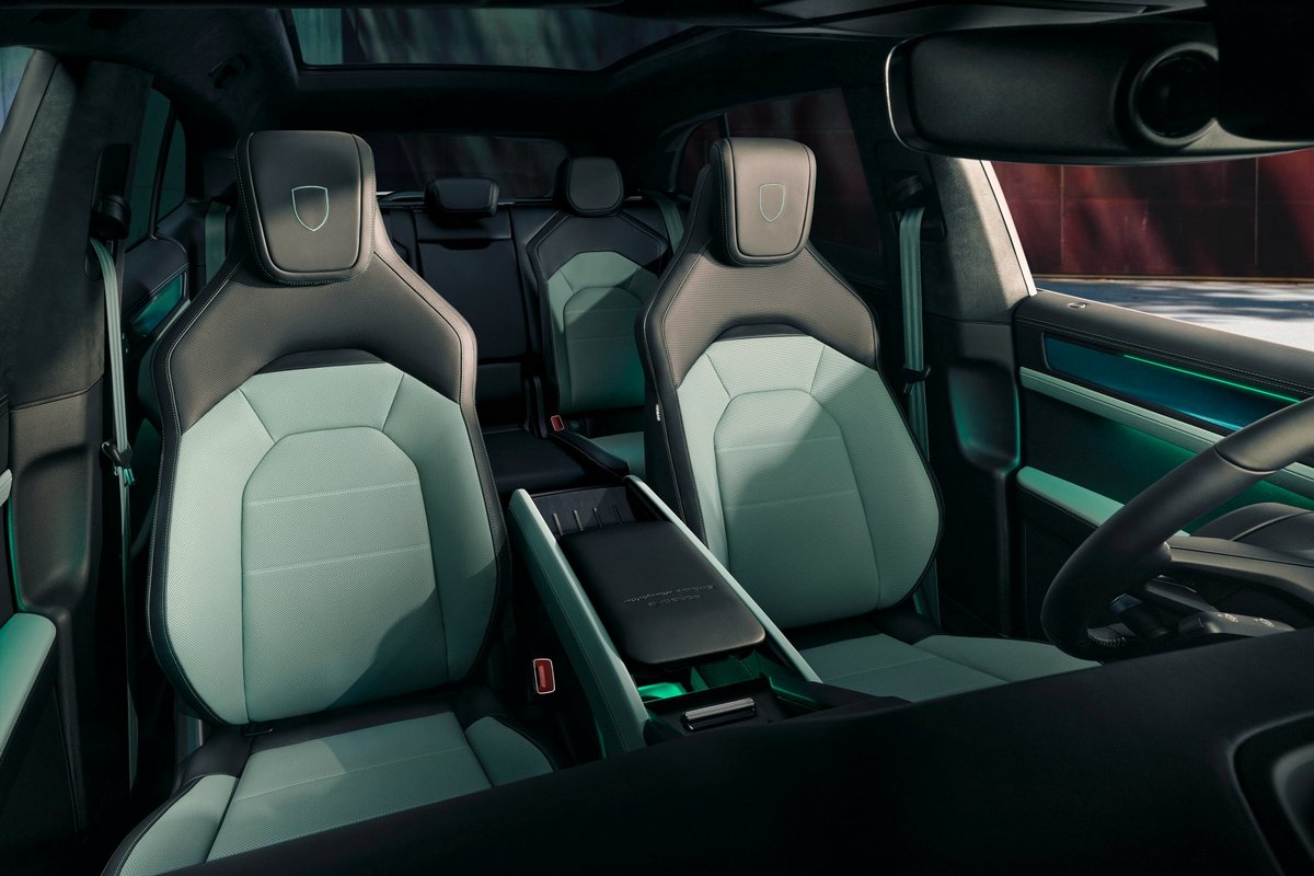 該套件在色彩與材質的演繹上,巧妙地與金屬神祕綠(Mystic Green Metallic)外觀車色相互輝映,為座艙注入摩登且尊榮的獨特氛圍。其視覺核心聚焦於黑色 (Black)與 德爾加達綠(Delgada Green)交織的雙色真皮內裝,並優雅地延伸至車門飾板與 14 向電動調整舒適型座椅;安全帶亦巧妙融入了這份色彩美學。而精緻的 德爾加達綠色對比色縫線 (Delgada Green),搭配頭枕上的保時捷盾型徽飾輪廓刺繡,更在每一處細節中,淋漓盡致地展現了保時捷對極致工藝的不懈追求。