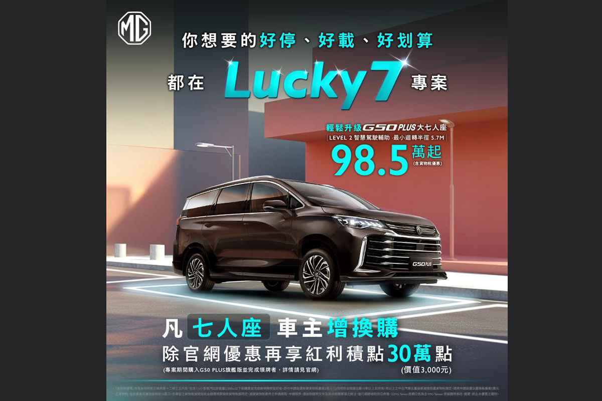 三月限時優惠期間,MG Taiwan祭出誠意十足的回饋方案,不僅HS 1.5T搭配限量典藏方案及舊換新補助後最低僅需75.9萬元起,都會休旅ZS 1.5L也同步享有59.9萬元起的超值入主價。此外,針對重視家庭載重與大空間需求的車主,正七人座MPV G50 Plus同步祭出「Lucky 7專案」驚喜禮遇,凡現役車輛為7人座車型之車主,於專案期間增換購G50 Plus 旗艦版,除原有的購車優惠外,MG Taiwan再加碼紅利積點30萬點(價值 3,000元),讓喜愛MPV的家庭用戶在換購升級時,不僅能擁有頂級舒適的乘坐體驗,更能滿載幸運與實惠。