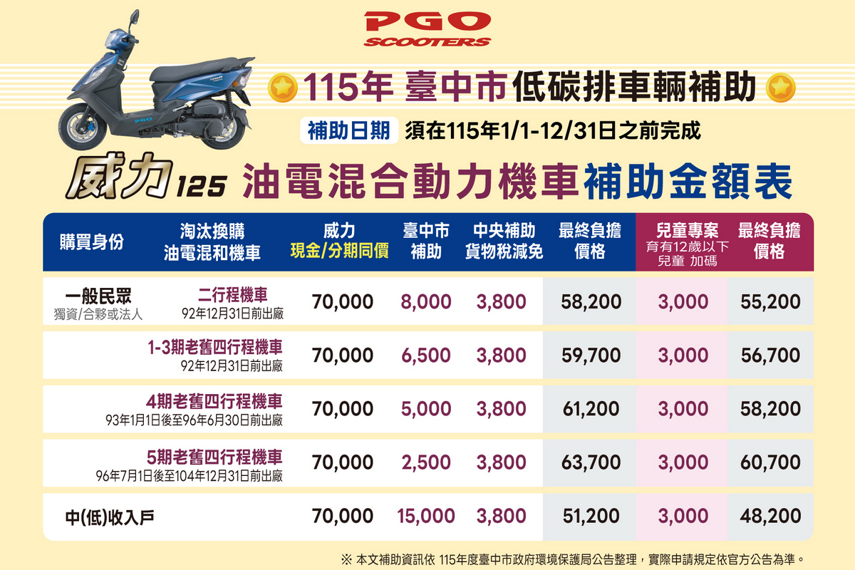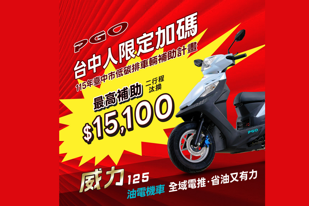 油價持續攀升中,選對車就是最直接的省錢方式。現下台中人買車最划算!台中市政府推出「115年臺中市低碳排車輛補助計畫」,針對二行程機車汰換油電機車補助最高可達15,100元。對於仍使用高油耗舊車的族群而言,現在正是升級油電機車換購威力125的最佳時機。PGO 威力125 以優異油耗、實用機能與親民入手門檻,結合補助政策優勢,成為通勤族對抗高油價時代的聰明首選。對於正在物色耐操、省油、且兼具科技感的騎士來說,威力125 無疑是解決高油價時代痛點的最佳方案。