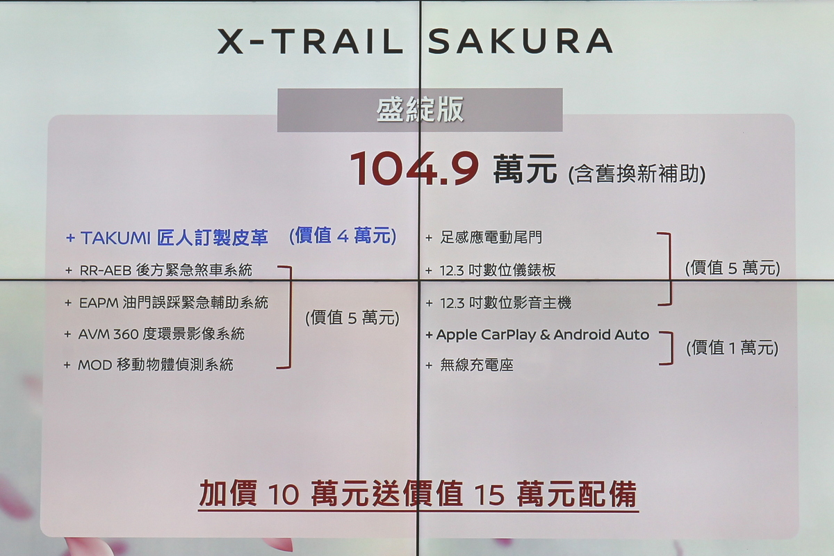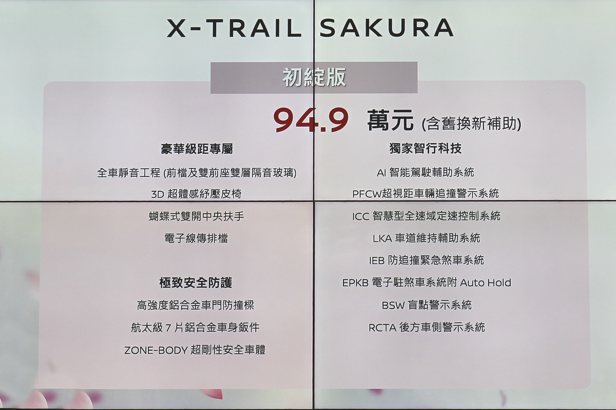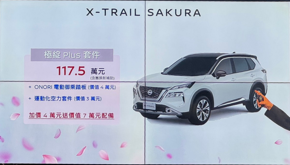 自2026年4月15日起至2026年4月30日止,於Nissan展示中心完成下訂X-Trail Sakura並完成領牌程序之新車車主,方具備本專案活動優惠資格。