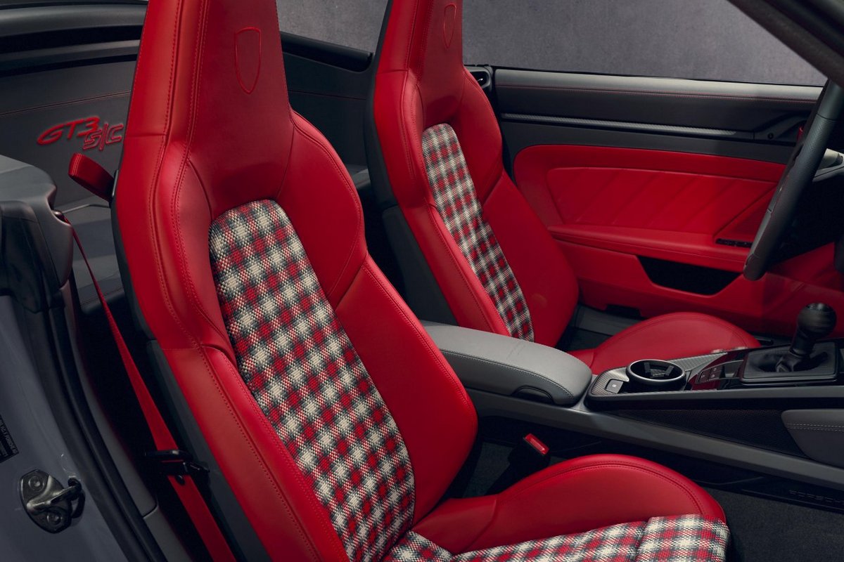 內裝採用輕量化地毯,搭配配置碳纖維車門拉環的輕量化車門飾板,深刻呼應 911 S/T 的經典設計語彙。911 GT3 S/C 採純雙座設定,標配四向電動調整跑車升級座椅(Sports Seats Plus)。車主亦可選配具備可收折椅背與碳纖維外殼的輕量化賽車桶型座椅。此座椅內建安全氣囊,具備電動高度與手動前後調整功能,並提供三段式座椅加熱選配。座艙標配黑色真皮內裝,一路延伸至遮陽板與 A 柱飾板。後艙隔板中央醒目點綴 GT3 S/C 專屬繡字。座椅中央椅面與方向盤皆比照 911 S/T,以打孔真皮包覆。承襲現行硬頂版 911 GT3 的純粹精神,911 GT3 S/C 捨棄按鍵啟動,保留位於方向盤左側的經典旋鈕式啟動開關。全數位儀錶板憑藉邏輯清晰的顯示與操作介面,提供極致直覺的駕駛輔助。「賽道螢幕(Track Screen)」模式將轉速錶兩側的資訊極簡化,僅保留輪胎、機油、水溫與燃油等核心數據。轉速錶兩旁的換檔指示燈精準提示最佳升檔時機。駕駛更可依個人操駕習慣旋轉顯示畫面,將高達 9,000 rpm 的轉速紅線區定錨於 12 點鐘方向。