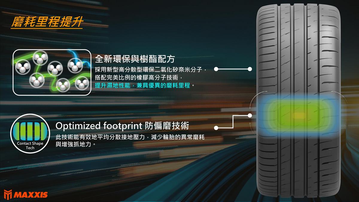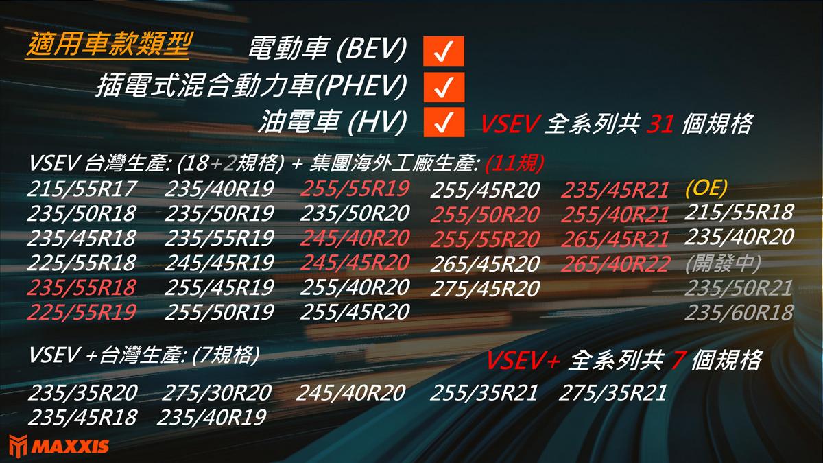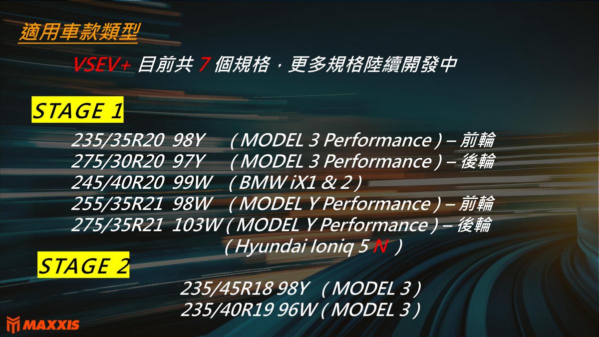 因應電動車市場快速成長,瑪吉斯於活動中發表新一代電動車專用胎 VSEV+。相較目前產品 VSEV 在乾地性能提升 5% 、濕地性能提升達 10%,並針對高階電動車高扭力輸出、車重較大的特性進行結構與配方全面優化操控穩定與靜肅表現。透過實車賽道體驗,經銷夥伴實際感受 VSEV+ 在精準轉向與低噪音表現上的優勢,VSEV+本次新增 7 個規格,完整對應主流高階電動車款需求。