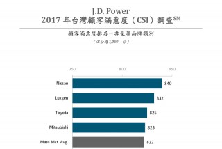 在此次非豪華品牌顧客的滿意度調查中,納智捷 (Luxgen) 以總分 841分 奪冠,日產 (Nissan) 和豐田 (Toyota) 則分別以 840 與 829 的總分搶下亞軍和季軍寶座。