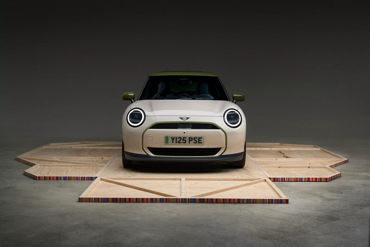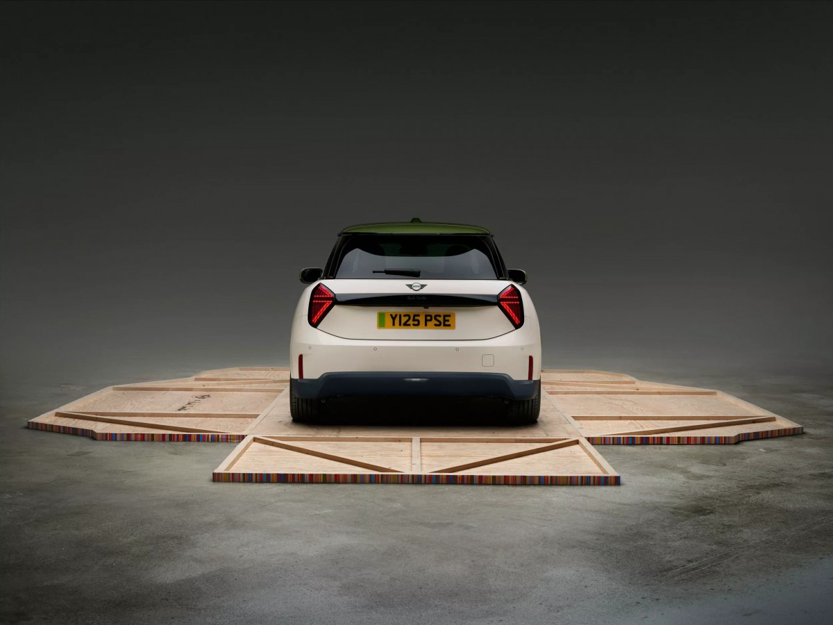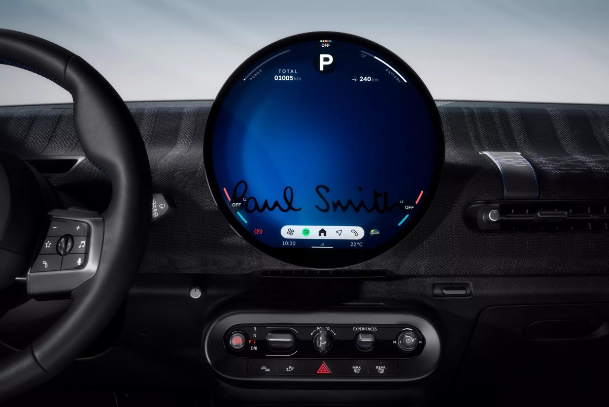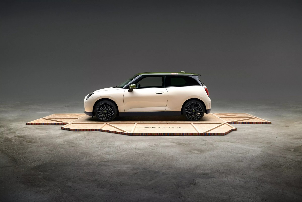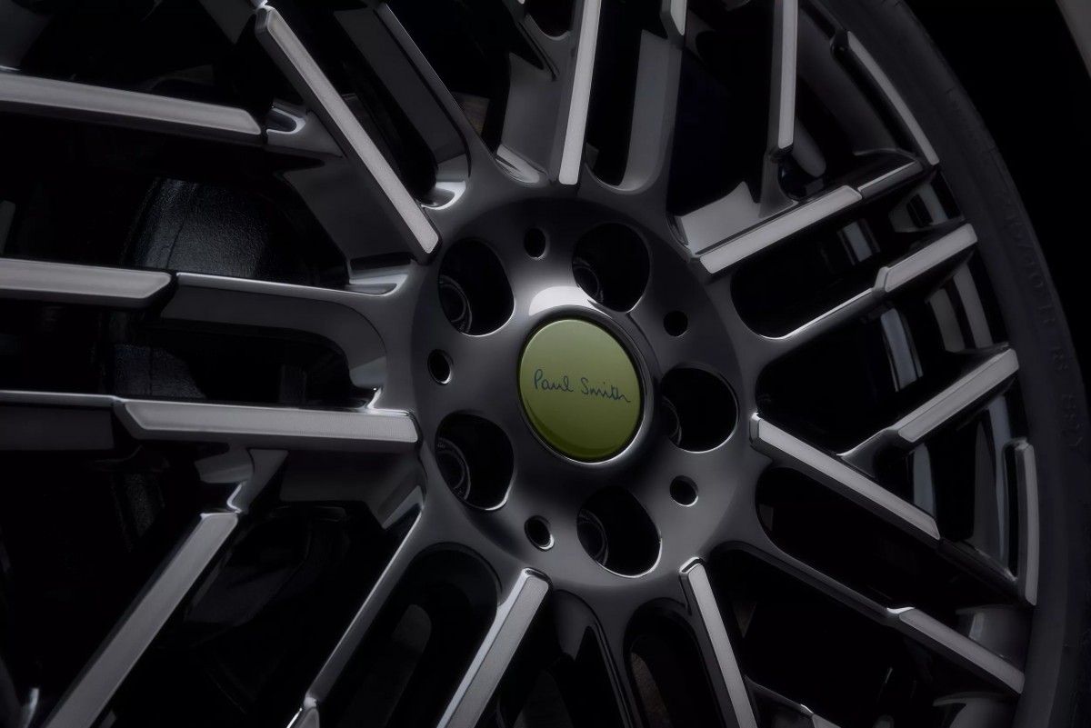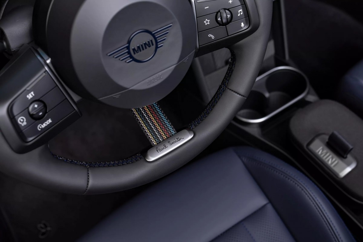 Paul Smith Edition的外觀主打三款專屬車色:Statement Grey(致敬1959年Mini Austin Seven的經典配色)、Inspired White(對傳統米色的現代詮釋)以及經典Midnight Black Metallic。車身各處點綴著Nottingham Green綠色元素,包括後視鏡、輪圈、進氣格柵,並可選配成對比色車頂設計,增添整體層次感。此外,三門與五門車型的車頂還設有專屬Signature Stripe條紋圖案,搭配黑色18吋鋁圈、黑藍Mini徽飾與Paul Smith簽名細節,散發出低調奢華的英倫時尚風格。
