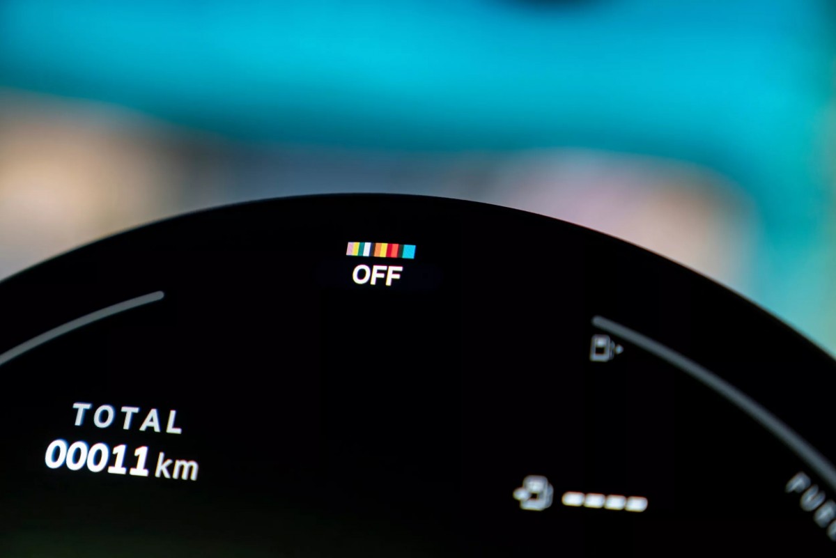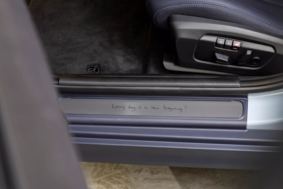踏入車艙,即可感受到Paul Smith的藝術精神在內裝中的體現。夜幕藍(Nightshade Blue)運動座椅結合人造皮革與雙色織布面料,展現視覺對比與舒適度。中控台與車門飾板則使用特別針織材質,呼應Paul Smith對布料工藝的熱情。方向盤上亦繡有Signature Stripe,突顯車輛獨特身份。更有趣的是,腳踏墊上還出現了一隻風格化的兔子圖案,增添趣味性與辨識度。迎賓燈則在車門開啟時投射出「Hello」字樣,搭配門檻飾板上的「Every day is a new beginning」標語,傳遞出正向且溫暖的品牌理念。