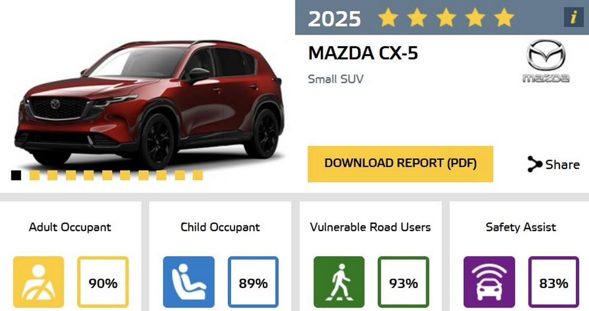 Mazda於今年中帶來新世代CX-5,近期Euro NCAP也替CX-5進行撞擊測試,其中在成人防護方面,正面撞擊前後成員都獲得良好保護,移動障礙物偏位撞擊駕駛胸部則僅有及格,其餘側向與鞭甩等部分則也有良好防護,因此綜合平均仍有90%成績,孩童方面無論撞擊或是警示等項目也都取得優異表現,而安全配備也有83%成績。至於行人防護部分,由於休旅車尺碼較高緣故,Euro NCAP也著重行人防護來降低撞擊後造成的傷害,這部分CX-5於保險桿、引擎蓋、擋風玻璃等處都達到降低對行人的傷害,唯獨擋風玻璃A柱處成績較不理想,其餘AEB行人/自行車/機車、後方來車開門警示等項目也都擁有出色表現,因此在行人項目部分取得93%優異成績,而該成績也高於EX30、T-Roc、Cayenne等車型。