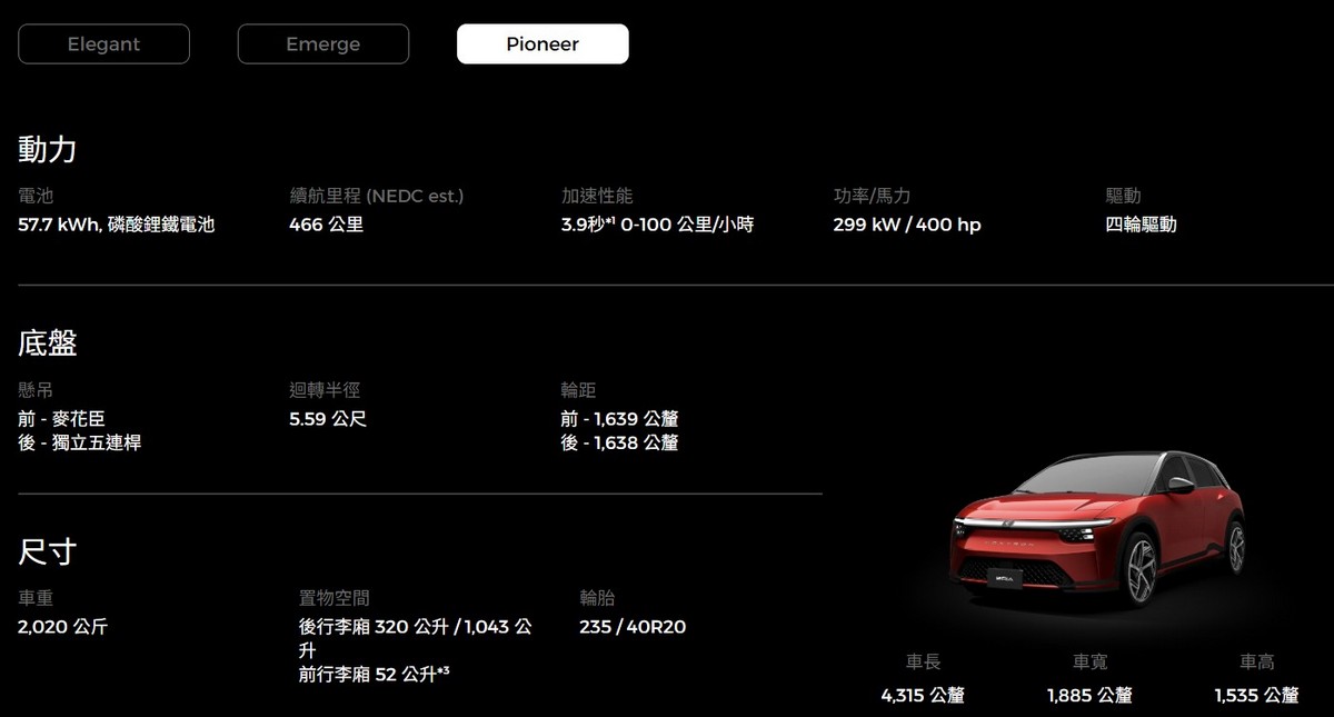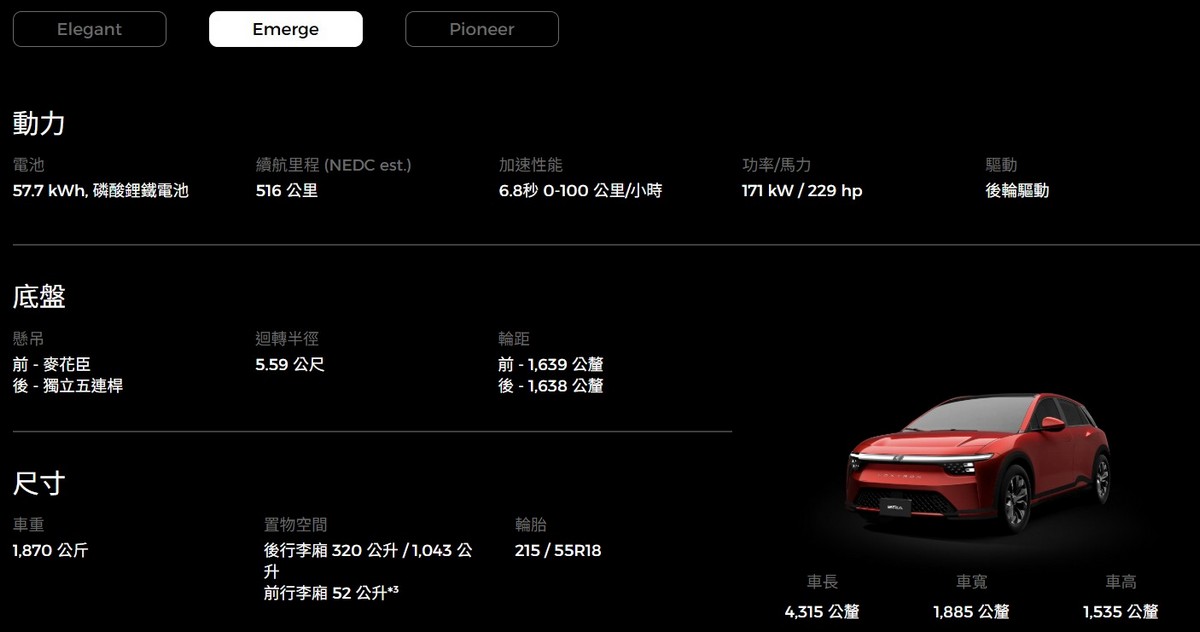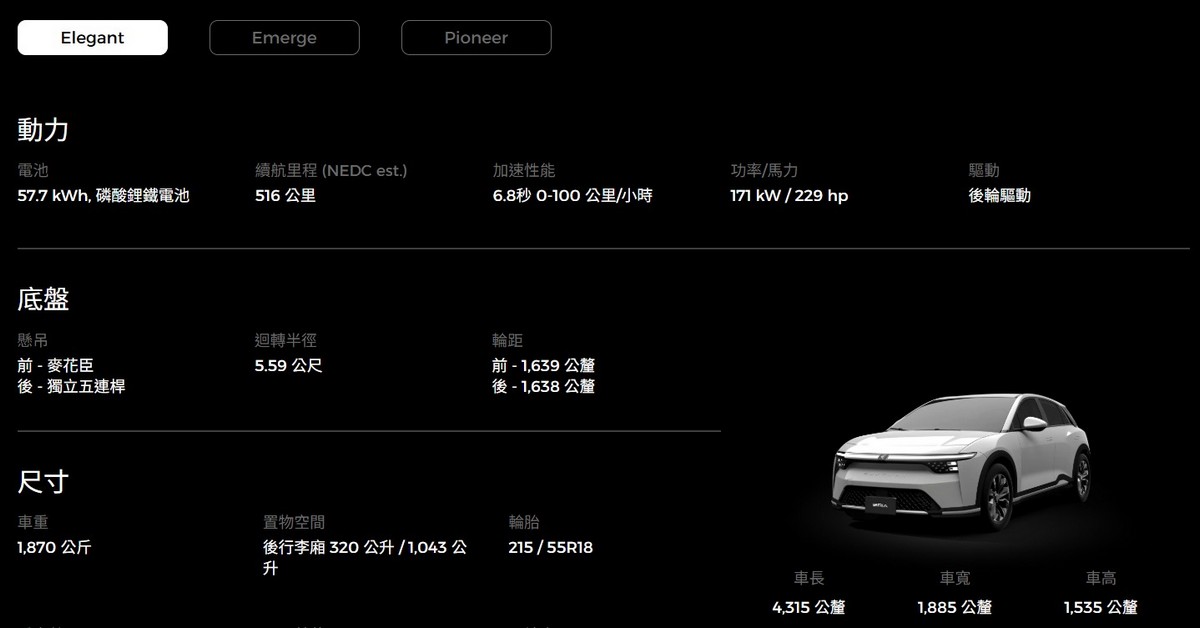 除了公布收購消息,當晚Foxtron Bria官網也一併上線,從目前官網公布的簡易資訊來看,Bria車型編成有規劃Elegant/Emerge/Pioneer三種車型,車身尺碼皆為4,315mm×1,885mm×1,535mm,車重Elegant/Emerge為1,870公斤、Pioneer則為2,020公斤,行李廂部分則是前52公升(Emerge/Pioneer)、後320~1,043公升容積。動力部分Bria皆配置57.7kWh磷酸鋰鐵電池,134kW充電功率讓10%~80%充電不到30分鐘,Elegant與Emerge搭載後馬達具有229hp最大馬力、0~100km/h加速6.8秒(扣除起步時間)、516公里續航里程(NEDC),Pioneer則是雙馬達擁有400hp馬力、 0~100km/h加速3.9秒(扣除起步時間)、466公里續航里程(NEDC)。