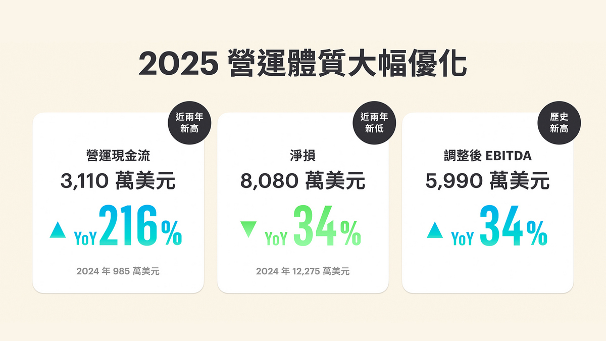 Gogoro 2025 年度財報數據亮眼,顯示「聚焦」策略已顯著提升營運體質,建立了強健的財務基礎,為邁向 2026 年能源事業損益兩平、2027 年產生自由現金流,以及 2028 年車輛事業損益兩平奠定穩固根基。全年營運現金流成長至 3,110 萬美元,較前一年大幅提升超過 2 倍;調整後 EBITDA 較 2024 年增加 34%,創下 5,990 萬美元的歷史新高。隨著營運效率提升與成本結構優化,全年淨損年減 34%,收斂至 8,080 萬美元。