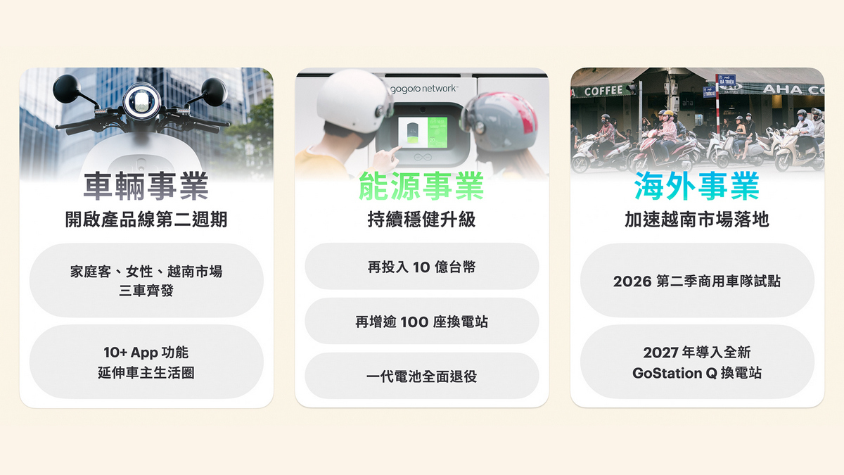Gogoro 歷經十年發展已成為台灣第四大車廠,並隨著 2025 年「聚焦」策略見效、營運體質大幅優化,正式啟動下一階段的產品佈局。隨著消費者生活情境與用車需求分眾化,Gogoro 將分別為女性、家庭客推出兩款新車、以及越南市場專屬車款,使產品更精準切合不同族群的使用情境。