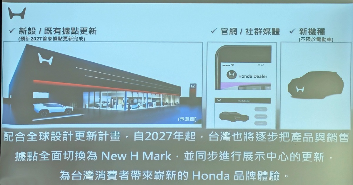 全新「H mark」將率先應用於2027年起的次世代四輪車款,並陸續運用於Honda四輪事業相關廣告、刊物等宣傳管道,針對未來的銷售網絡布局,Honda Taiwan將自2027年起啟動全國四輪經銷據點品牌形象升級工程,全新「H mark」將廣泛應用於全台Honda Cars經銷據點,致力打造結合先進科技與提供Global Honda一貫的高規格服務品質與環境。
