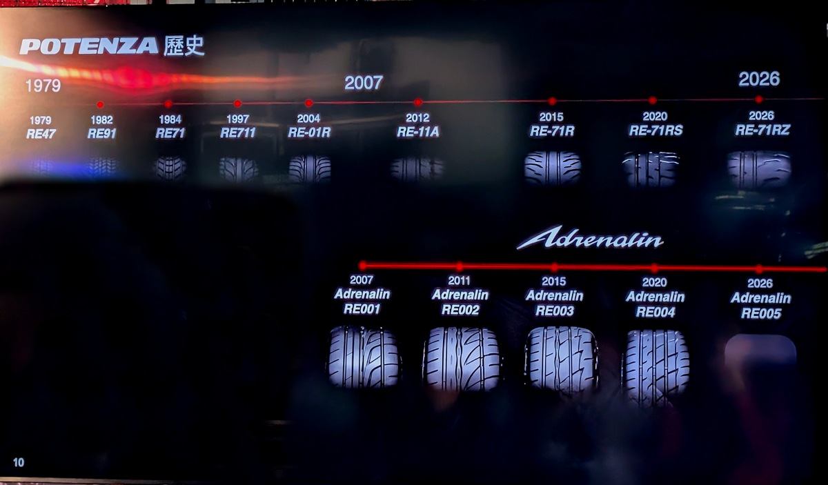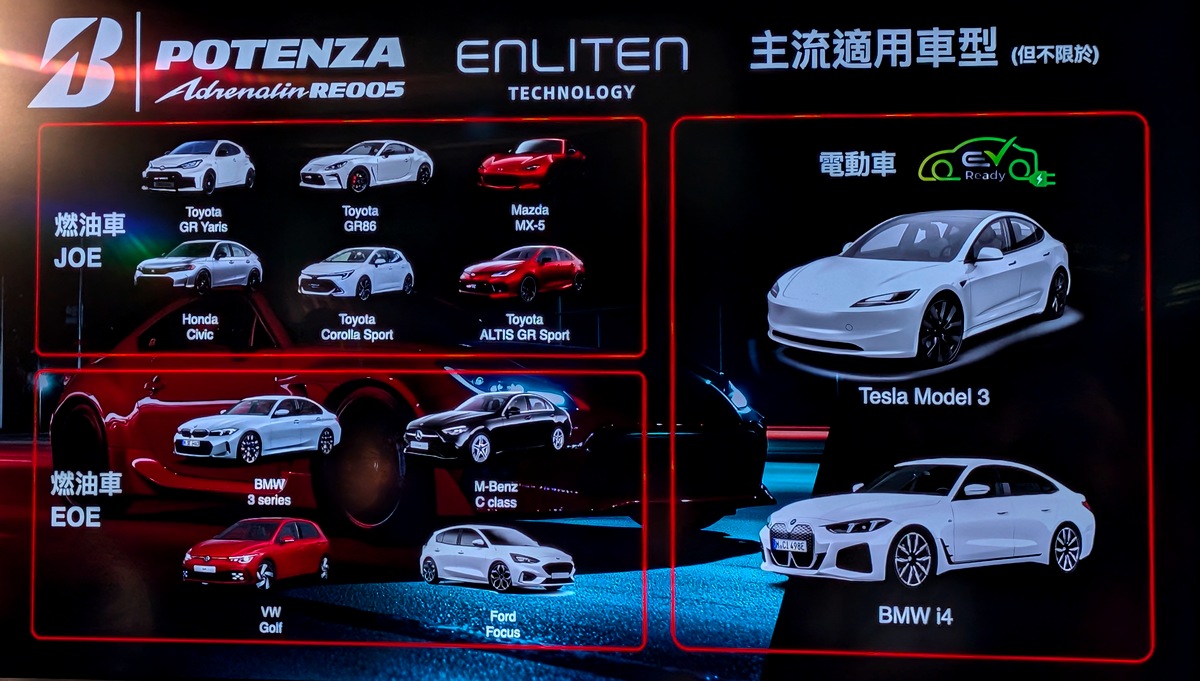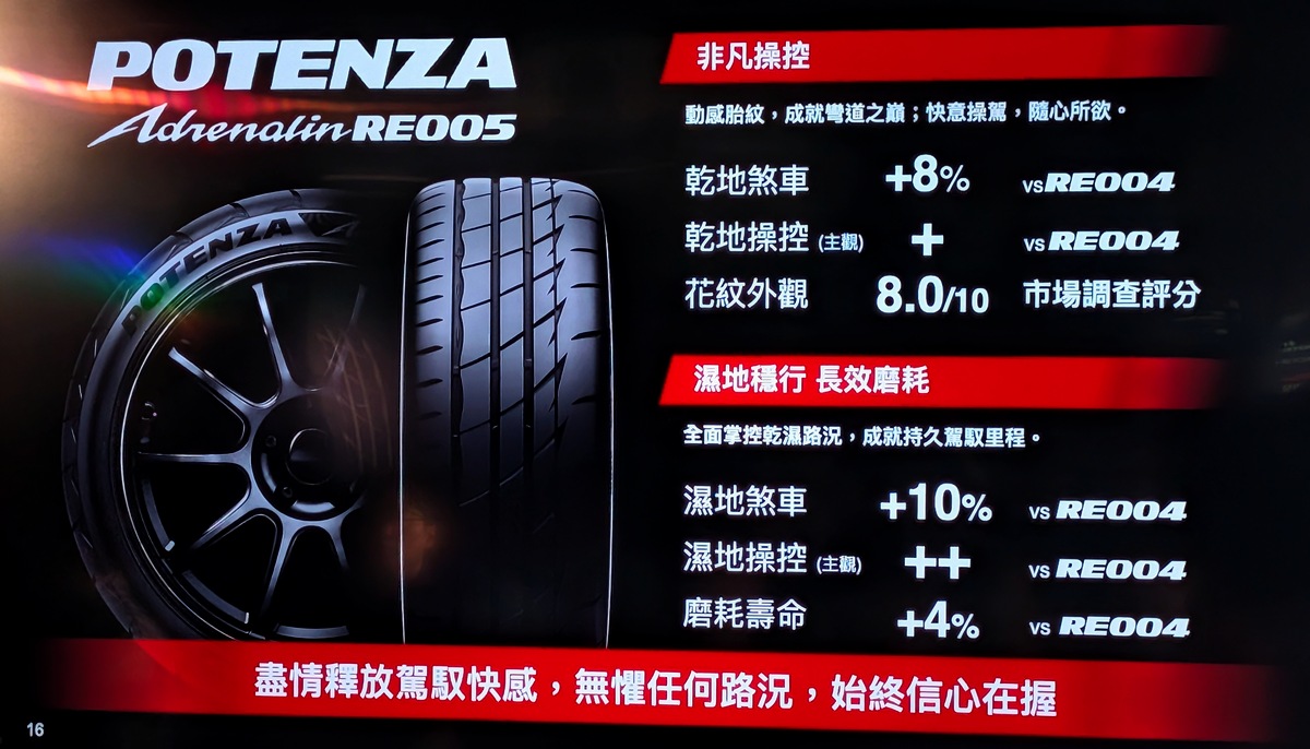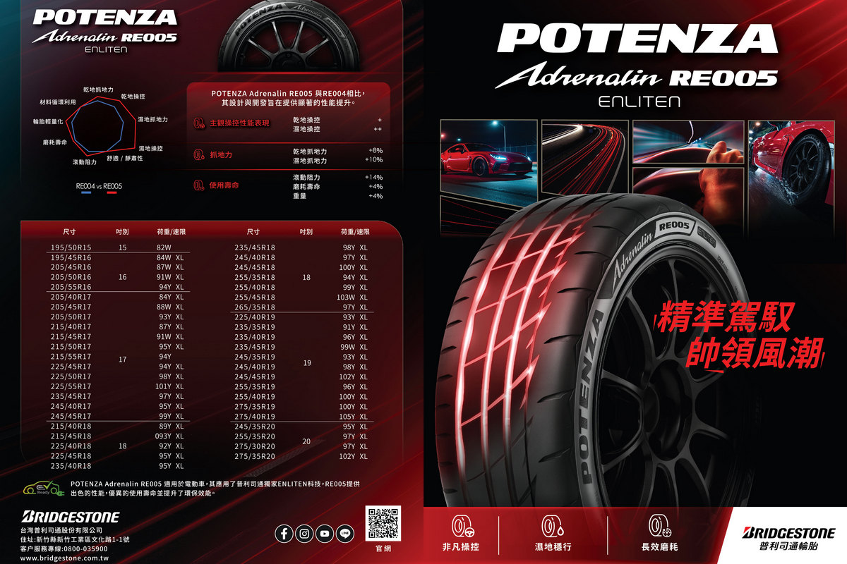 Bridgestone Potenza Adrenalin RE005 今於台灣市場提供 15 至 20 吋的多元選擇,適用於各種乘用車型,實際供應規格將依各通路而有所不同。