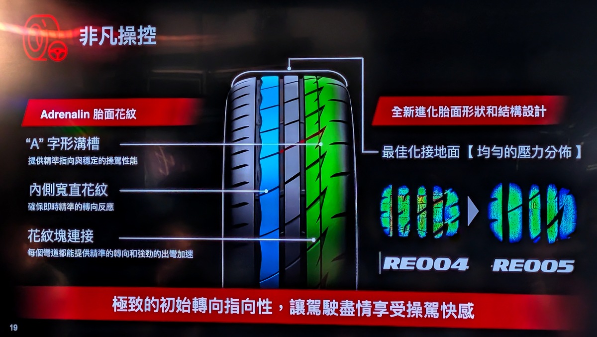 以駕駛為核心設計的 RE005,搭載「脈衝排水溝槽」(Rain Pulse Groove)大幅強化排水效率並降低水漂風險。全新的橡膠配方則賦予其卓越的全天候抓地力,從濕滑路面到高速過彎,皆能提供安心的回饋;同時,該配方優化的耐熱性,確保輪胎在高負載或長途行駛下,仍能維持穩定且一致的性能表現。