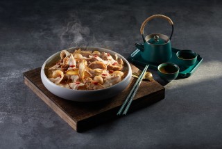 冠軍筍梅菜扣肉(NT$780元):精熟粵菜同時又承襲客家家傳滋味的邱主廚,做起工序繁複的梅干扣肉駕輕就熟,結合時令綠竹筍入菜,更添層次。帶皮五花肉先醃再蒸到七分熟,接著乾烙表皮,並用鬆肉針在皮上扎孔後酥炸,使皮層爆開,逼出多餘油脂也利於醬香入味。取此五花肉和鮮筍各自切成厚片,層層交錯疊鋪於碗底,中央填上以南乳、紹酒、醬油滷製的梅干菜,入籠蒸兩小時後倒扣上桌。鮮嫩冠軍筍片吸附梅菜香氣,又有油脂滋潤,美味至極!