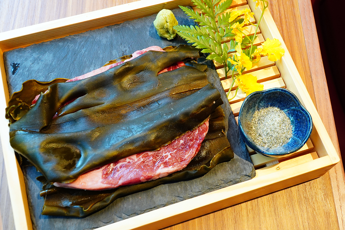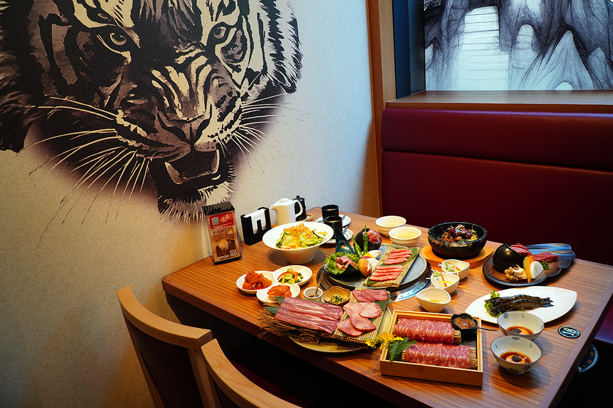 「焼肉の名門赤虎」創立之初,依據台灣消費者點餐偏好推出多款不同價位、組合的招牌雙人套餐,不需費神選餐且能精準控制預算,因此深受歡迎,然而隨著熟客造訪次數增加,為提供消費者更多彈性選擇,菜單上肉品拼盤的選項也愈加豐富,例如主打和牛豐腴滋味的「豪華船盤組合」、匯集五花、牛肋條等不同部位的「日本國產牛極上四選」,和彈、脆、嫩、滑兼備的「牛舌滿貫拼盤」等,都是老饕鎖定的熱門組合。配合新莊店開幕,赤虎再推全新「滿腹拼盤」,集結美國Prime腹肉牛五花、美國Choice牛五花、美國牛培根、西班牙松阪豬、台灣豬培根等不同油花分佈的豬、牛部位,總重達440克,牛肉分別以燒肉醬、甘口醬調味,豬肉也以味噌醬和鹽快速抓醃,燒烤後脂香、醬香四溢,與台產越光米飯一起扒送入口,肉與澱粉完美結合、滋味迷人。「焼肉の名門赤虎」不僅在選肉、修肉、切肉上下功夫,在享用方式上也不斷開發創新,或援引日本流行、或從經典料理尋找靈感,讓燒肉不僅變得更美味也更有趣。例如單點新品「昆布肋眼」即是將日料傳統醃漬法帶入燒肉,選澳洲穀飼牛肋眼以清酒擦拭過的北海道日高昆布包裹醃漬48小時,讓昆布的鮮味成分慢慢滲入肉中,上菜時由服務生在爐邊燒烤至五分熟,再將肋眼拆分為老饕和肋眼心,搭配海苔鹽品嚐,一塊牛排可享受雙重口感。「和風月見牛五花」靈感來自壽喜燒,選用美國Prime腹肉五花薄切,單面炙烤後再沾取以燒肉醬、大成生食級蛋黃、松露醬調和的升級版醬汁享用,鹹甜滑潤之餘,松露醬更提升了牛肉香美。剩餘的松露蛋黃醬則可以淋在白飯上,轉身變成日本人最愛的國民美食TKG(生雞蛋拌飯)。 「千層腹肉五花」則是將和食最重視的高湯文化與燒肉結合,薄切的腹肉五花層層堆疊,上桌前以特製燒肉醬調味,牛肉表面炙烤後產生焦香味,重疊的部分呈半熟狀態,先將肉片浸潤在加了鹽昆布的柴魚高湯,入口時更凸顯牛肉鮮美,剩餘高湯則可先嚐原味再滴入米醋飲用,韻味清爽不膩。