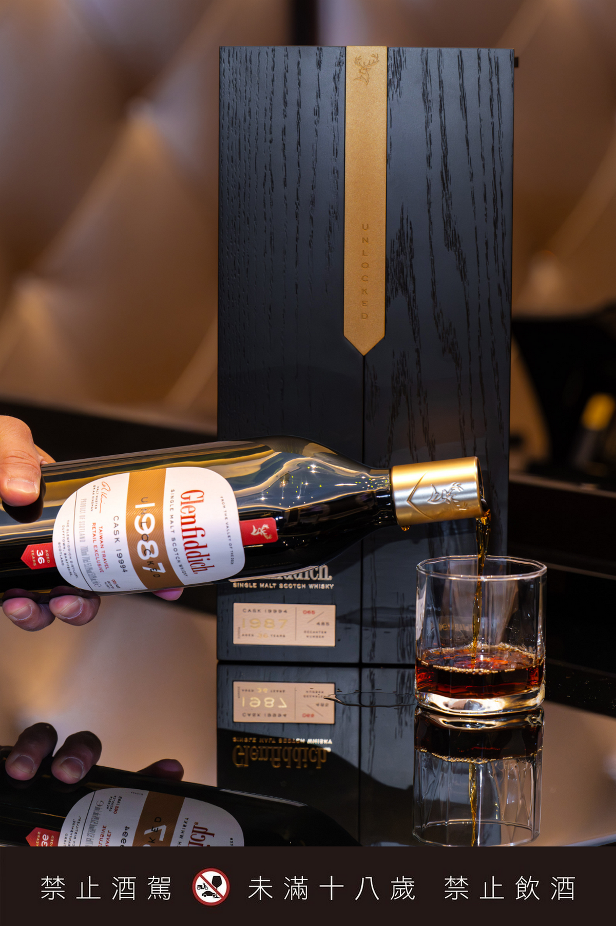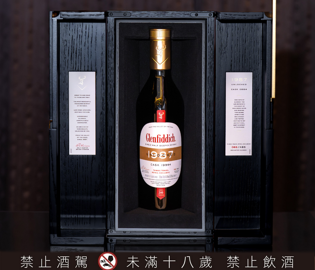 以格蘭菲迪現存最早收藏的歷史酒款為靈感,延續經典三角瓶型,象徵單一麥芽威士忌不可或缺的三大元素——大麥、水與酵母。高級無鉛水晶瓶身,搭配金色瓶蓋與封口,低調中流露細緻質感。酒標復刻1960年代的經典紅色品牌字,並標示酒桶編號與專屬瓶號,細節之中,悄然訴說這款百年紀念之作的獨特身分。珍貴黑梣木打造的收藏盒,雙開「沙龍門」設計,如同揭開一段被時間封存的故事。沉穩內斂的木質紋理,襯托出酒款的歷史份量,而酒標與盒身上限定的台灣標示與專屬瓶號,更賦予每一瓶酒唯一身份,成就無可替代的珍藏價值。