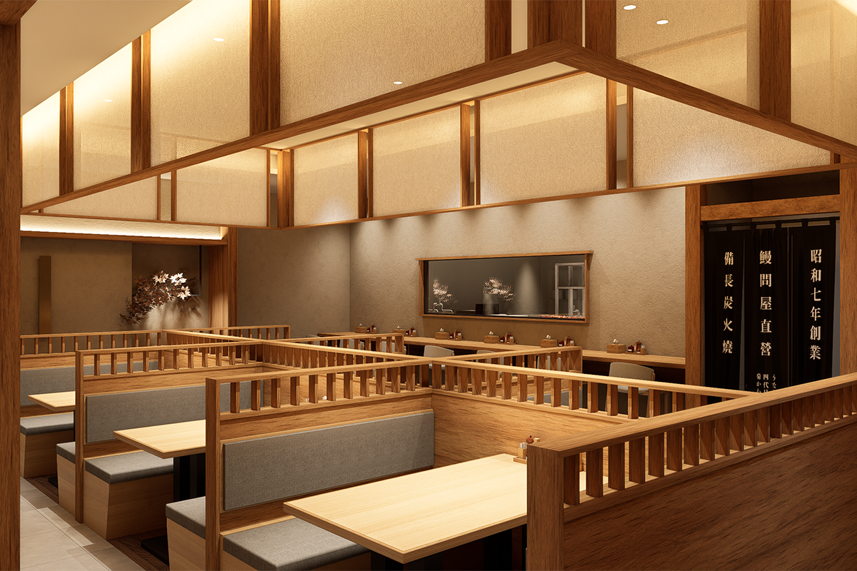 整體空間以溫暖木質調風格帶來店鋪主軸,具隱密氛圍的玄關處,也以招牌一本鰻 的「一」字、象徵圓滿的鰻魚形象設計出醒目標誌。店鋪整體約佔 49 坪,用餐空間延續「うなぎ四代目菊かわ」最重視的真實,以大片玻璃延伸廚房視野, 饕客可在用餐過程看見職人烤鰻工序,同時也備有三間包廂,提供客人隱密用餐。